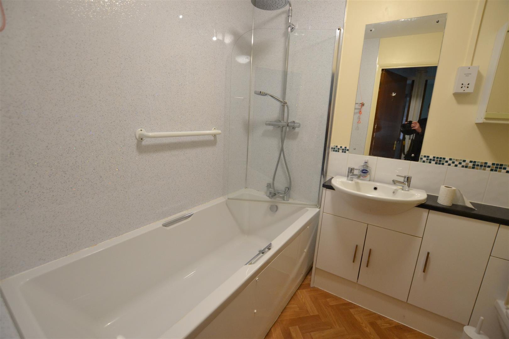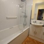 The bathroom has a modern suite in white of a panelled bath with hand grips, shower over and including a hand shower and a rain shower. There is wet board panelling, built-in vanity wash hand basin and an enclosed low flush W.C. There is a ceiling light, downflow electric heater, safety hand rail and also a heated towel rail.