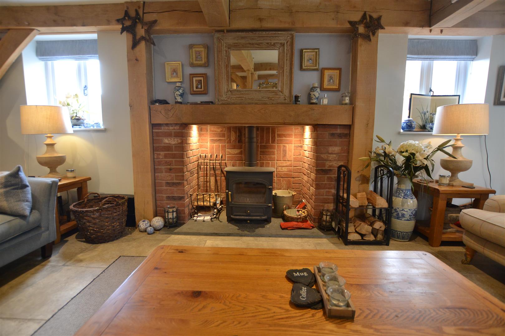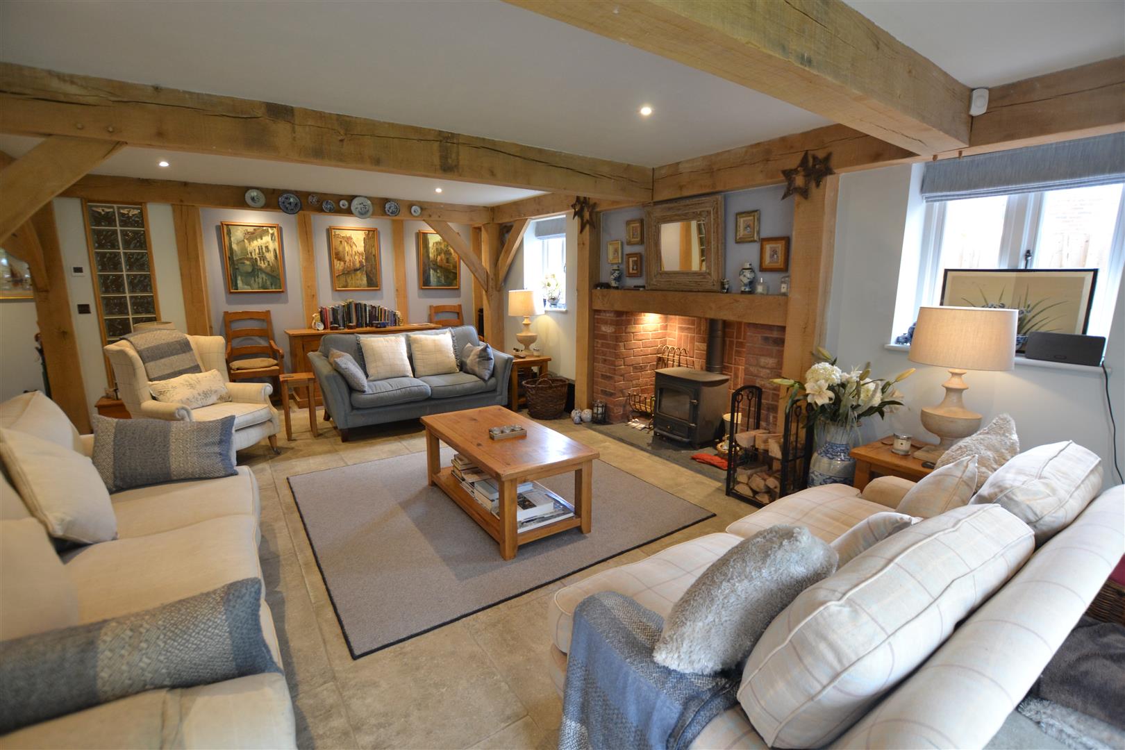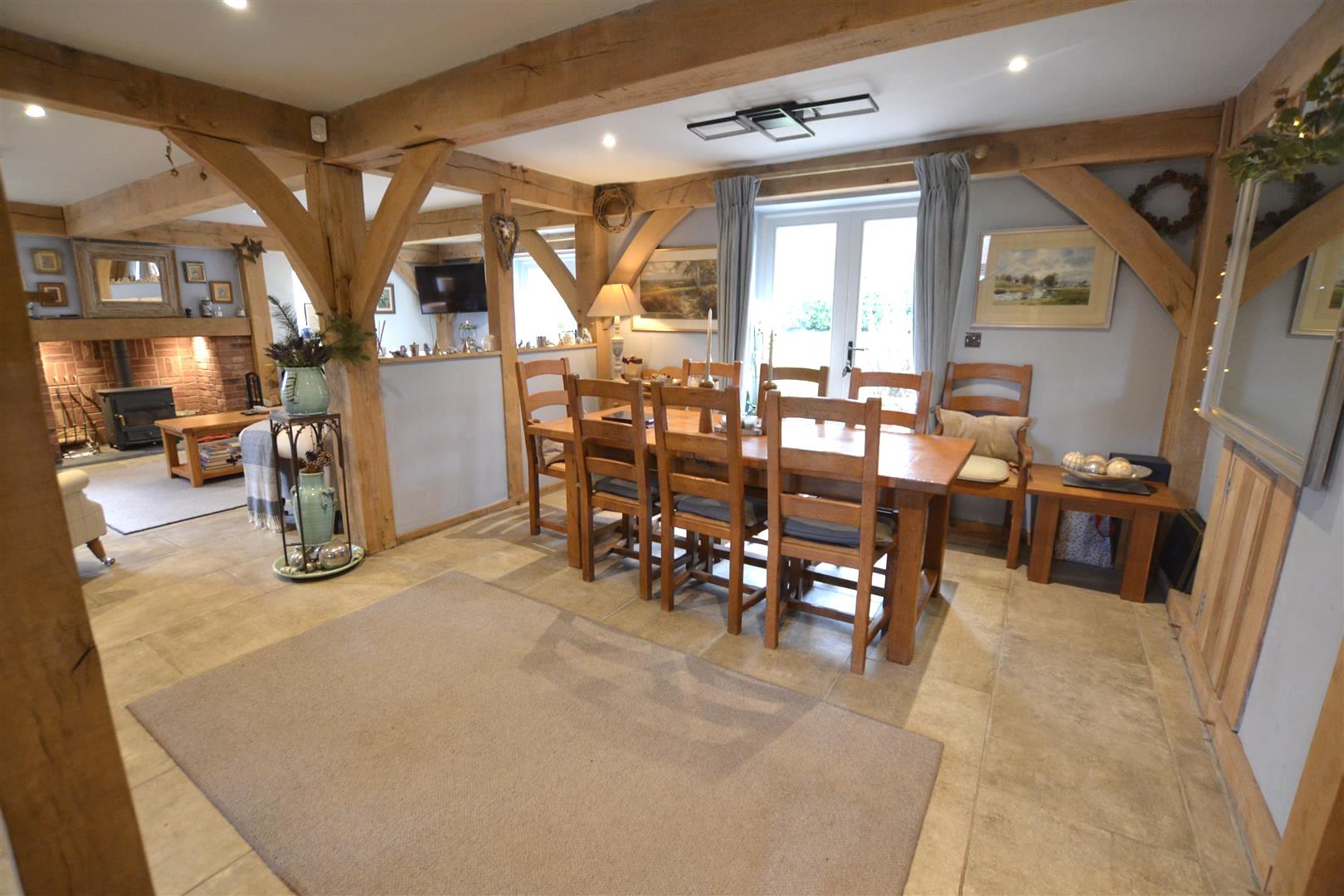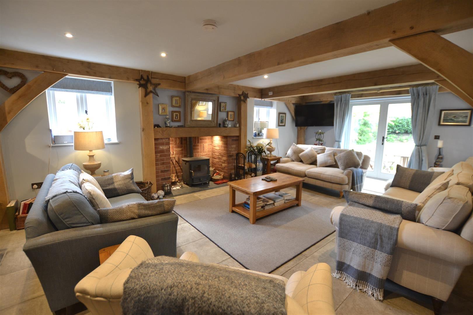 The living room has a Clearview stove set into a brick fireplace with an oak timber over, exposed wall and ceiling timbers, French doors to the rear and windows to the sides overlooking the rear gardens.