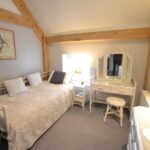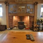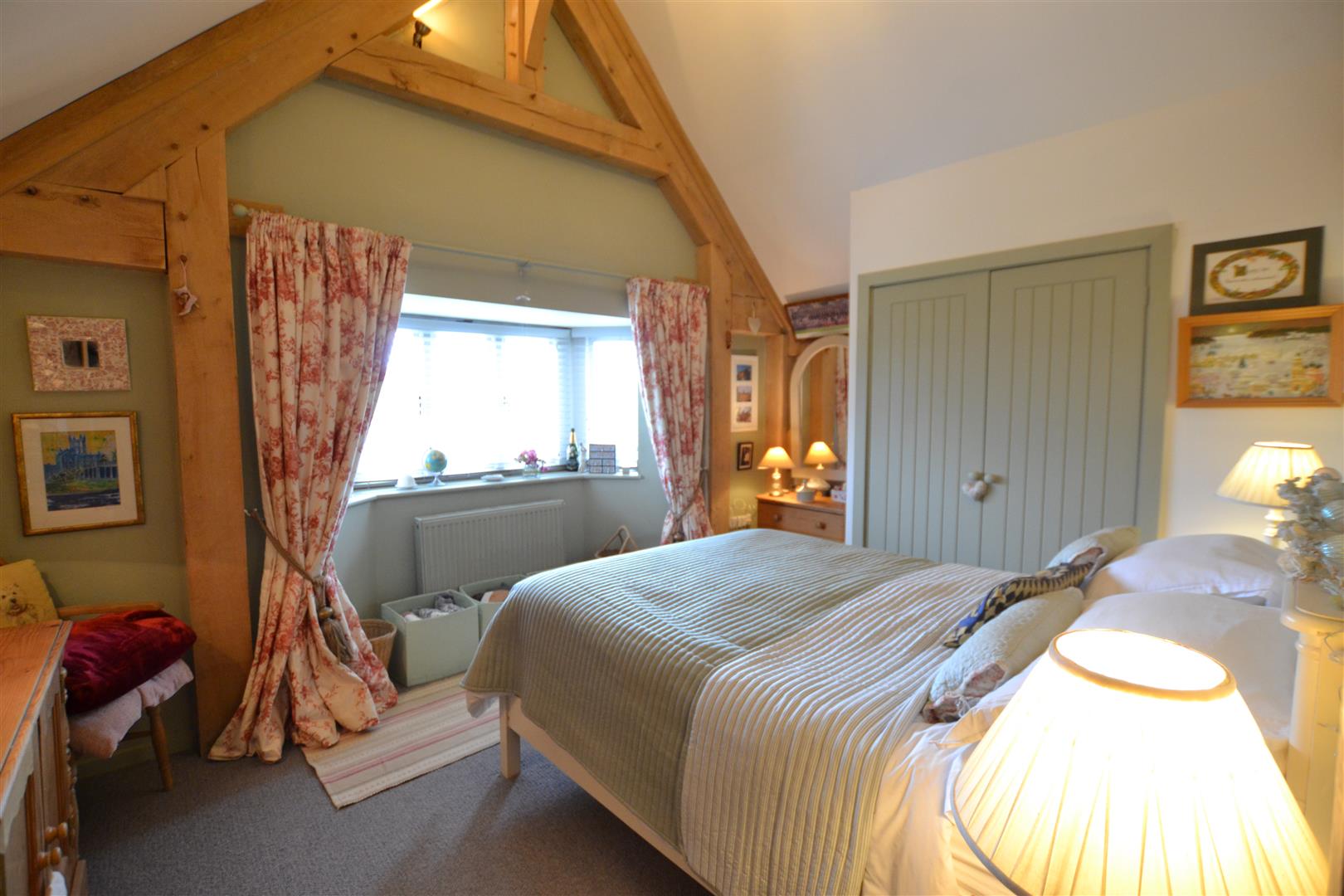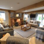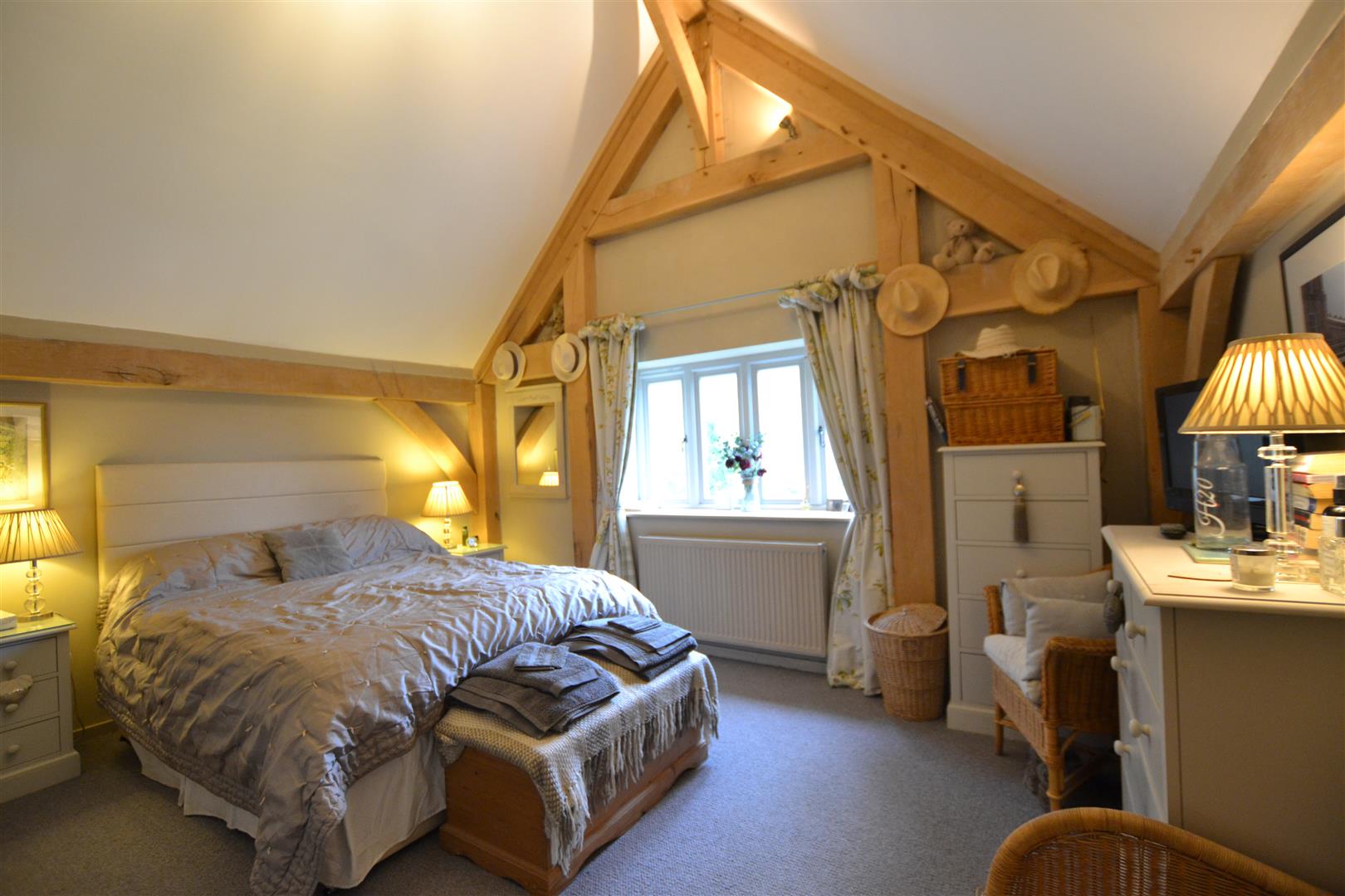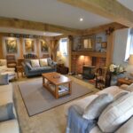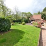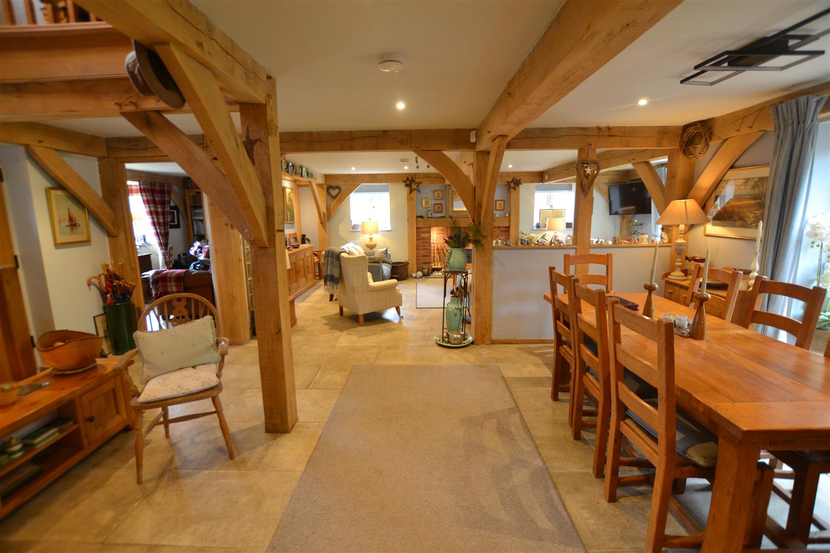 The living room has a Clearview stove set into a brick fireplace with an oak timber over, exposed wall and ceiling timbers, French doors to the rear and windows to the sides overlooking the rear gardens.