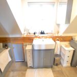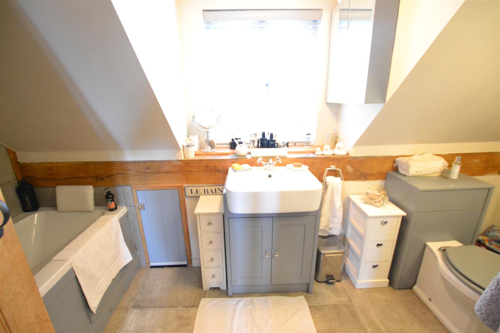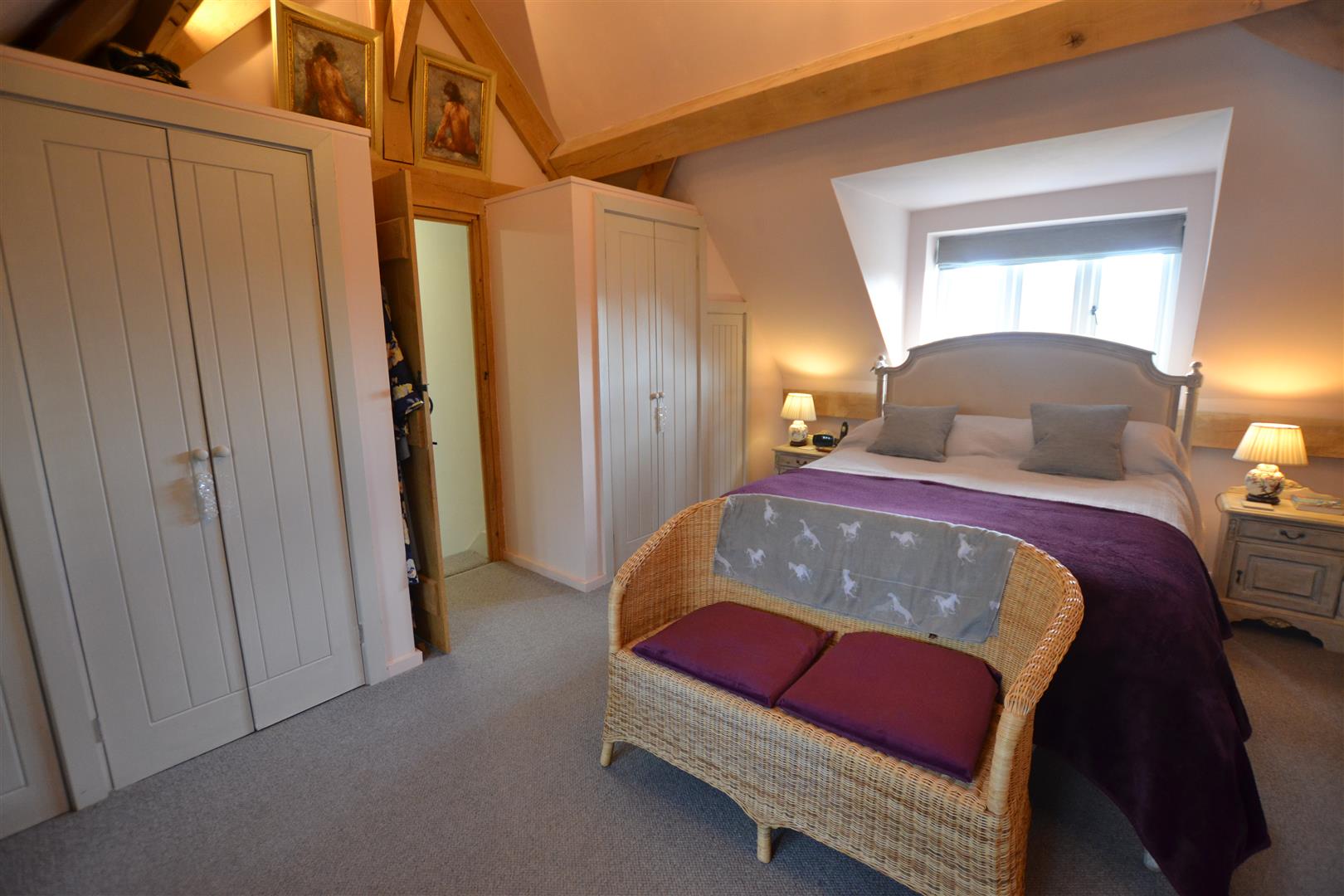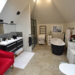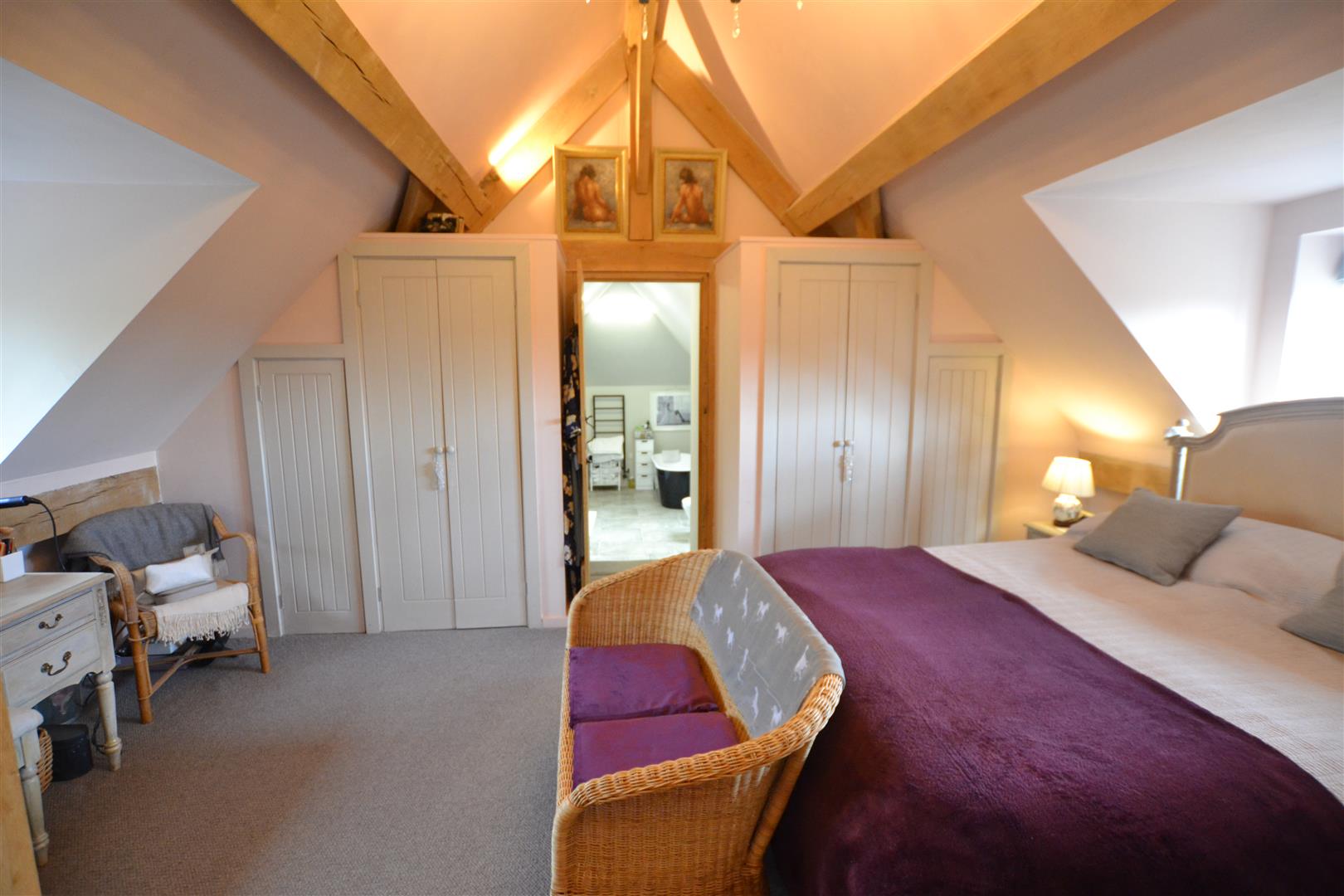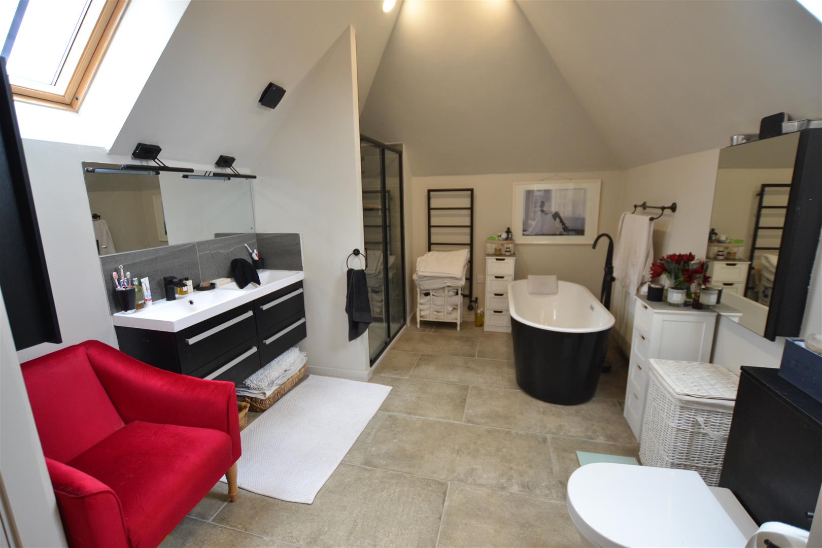 The modern fitted en-suite bathroom has a 4 piece suite to include a walk in shower, roll top bath, twin sink units with drawers under, 2 built-in wardrobes within the dressing area, 2 Velux roof lights.and access to eves storage.