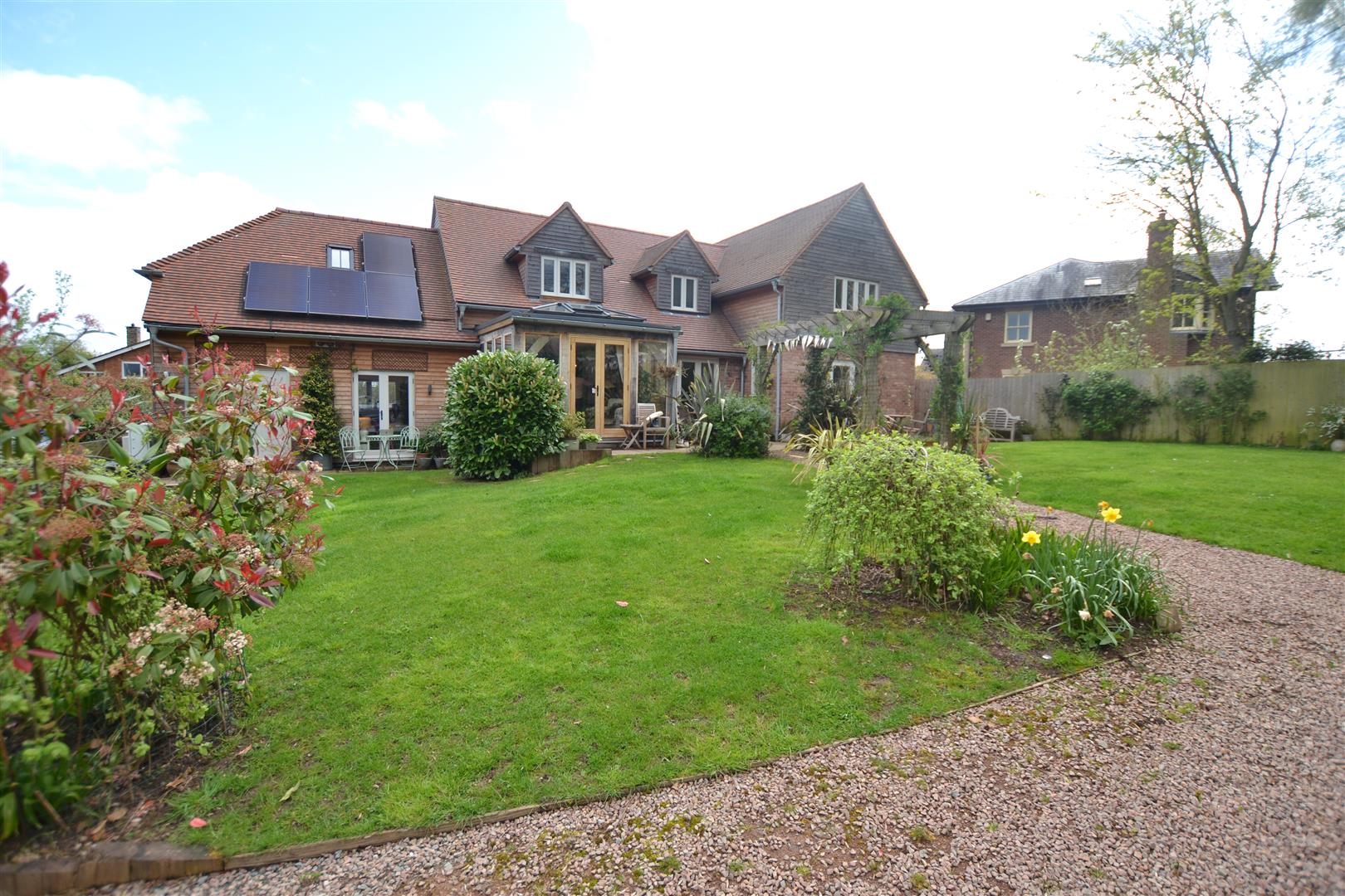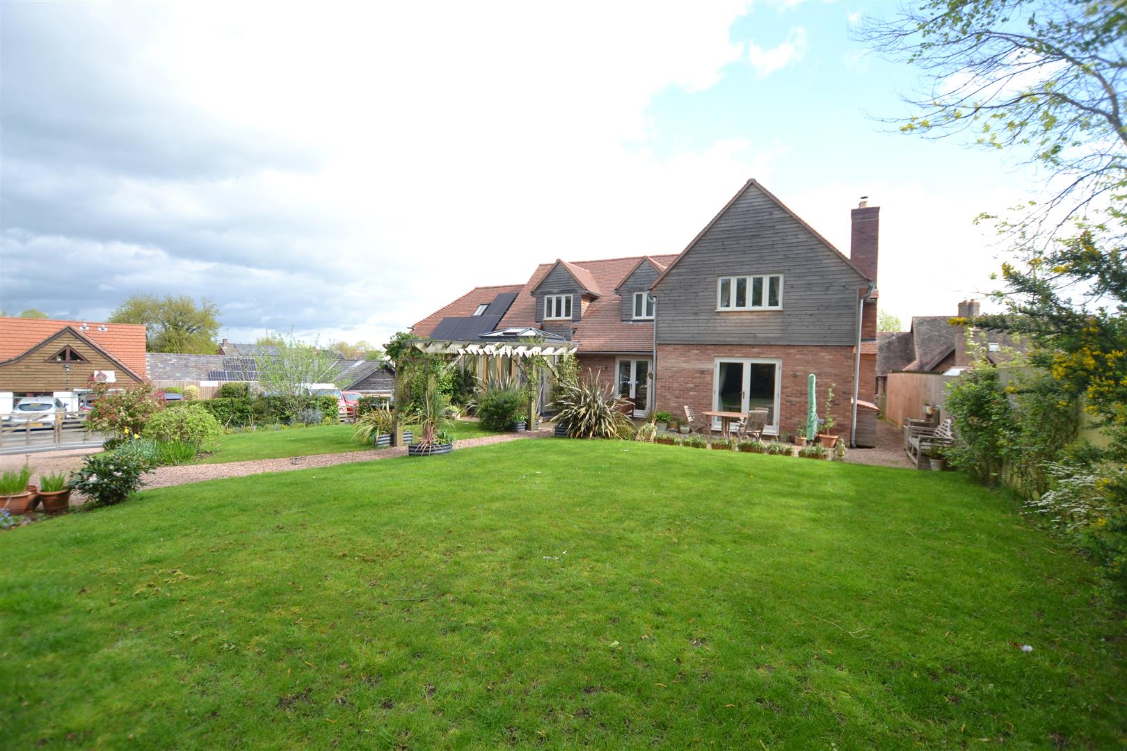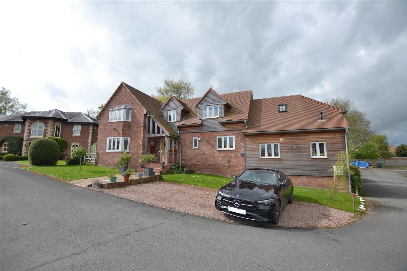 The property is situated in a select development of just 4 executive style houses and is well positioned for Weobley's village centre. There is a gravelled driveway to the front with parking for vehicles, lawned gardens and a slab pathway giving access to the main front door. To the side of the property and is gated access onto a large, additional driveway with plenty of parking for vehicles and at the end of the driveway is a large open fronted garage.