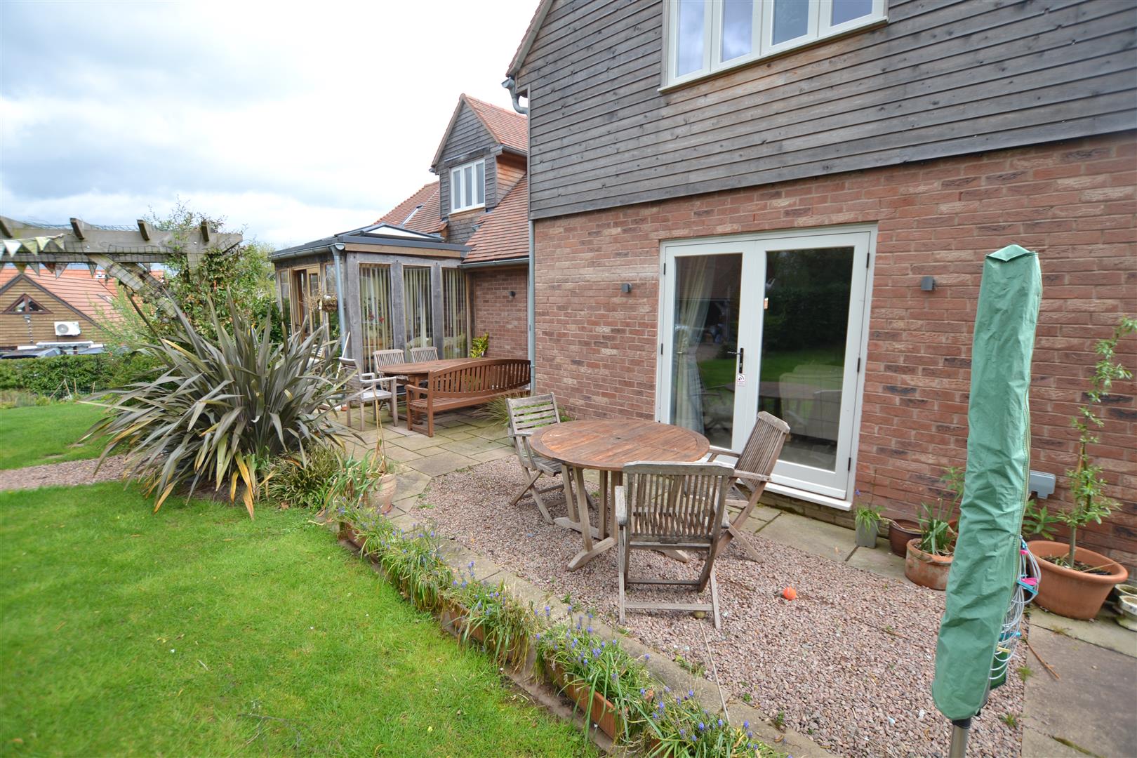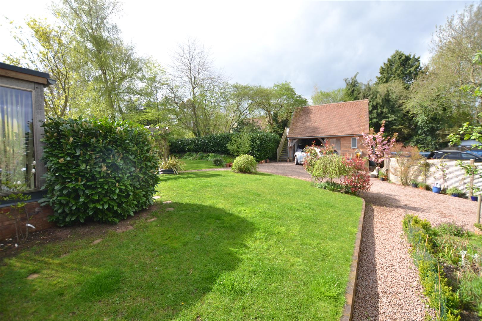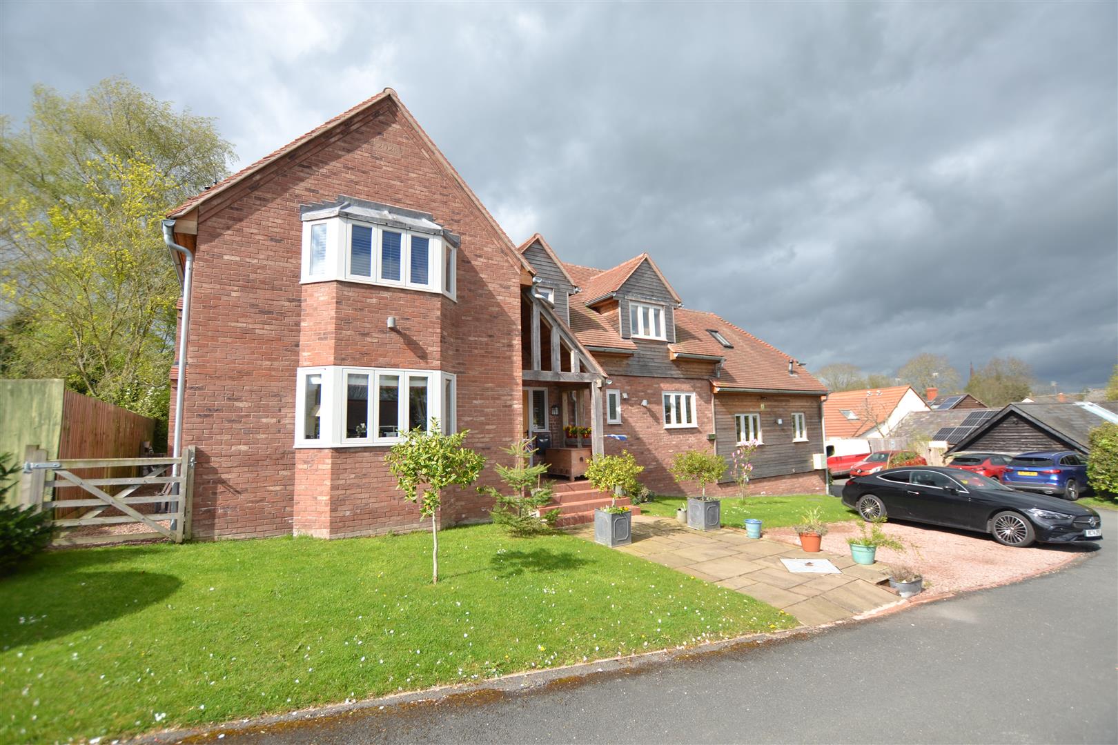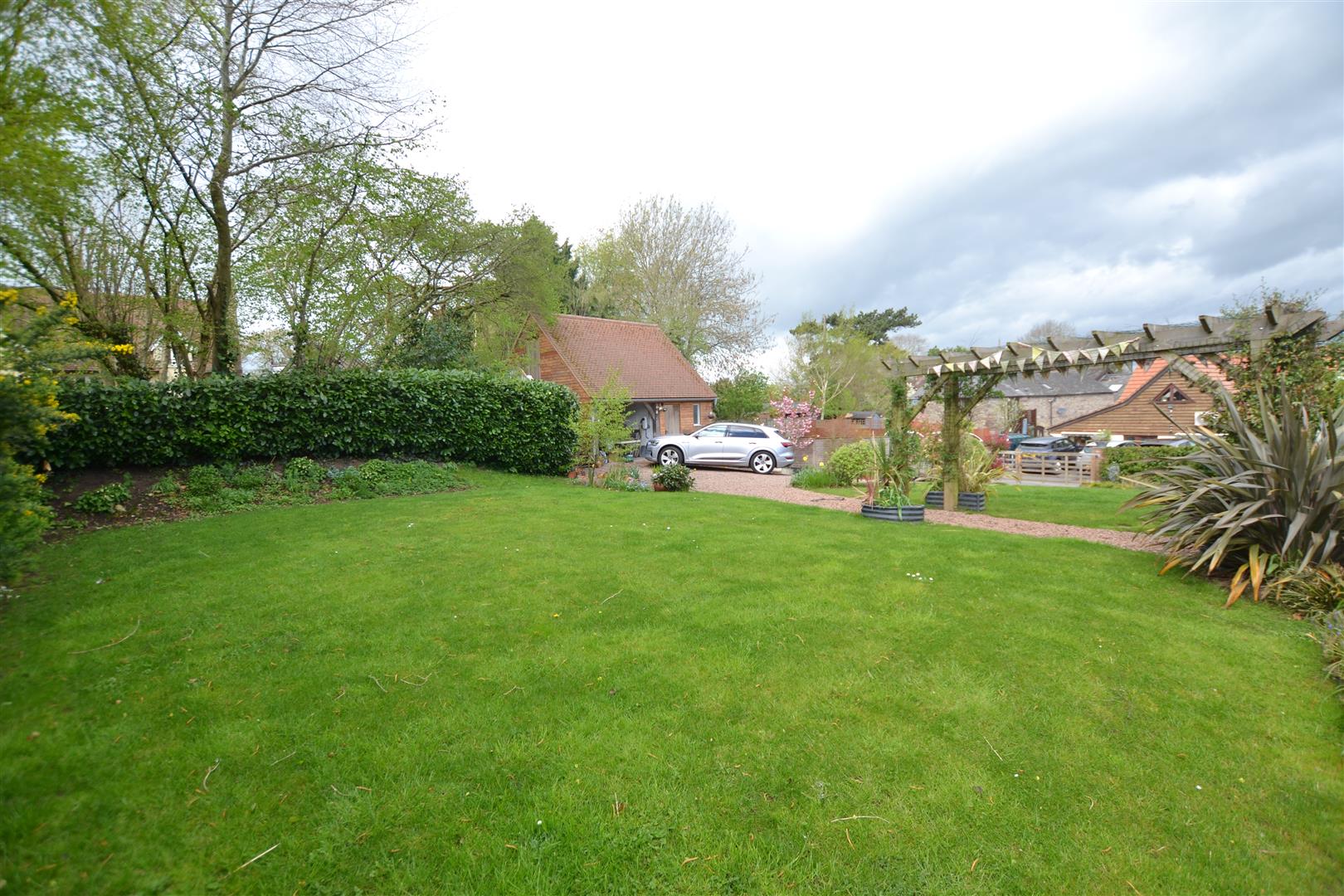The property is situated in a select development of just 4 executive style houses and is well positioned for Weobley's village centre. There is a gravelled driveway to the front with parking for vehicles, lawned gardens and a slab pathway giving access to the main front door. To the side of the property and is gated access onto a large, additional driveway with plenty of parking for vehicles and at the end of the driveway is a large open fronted garage.
