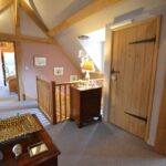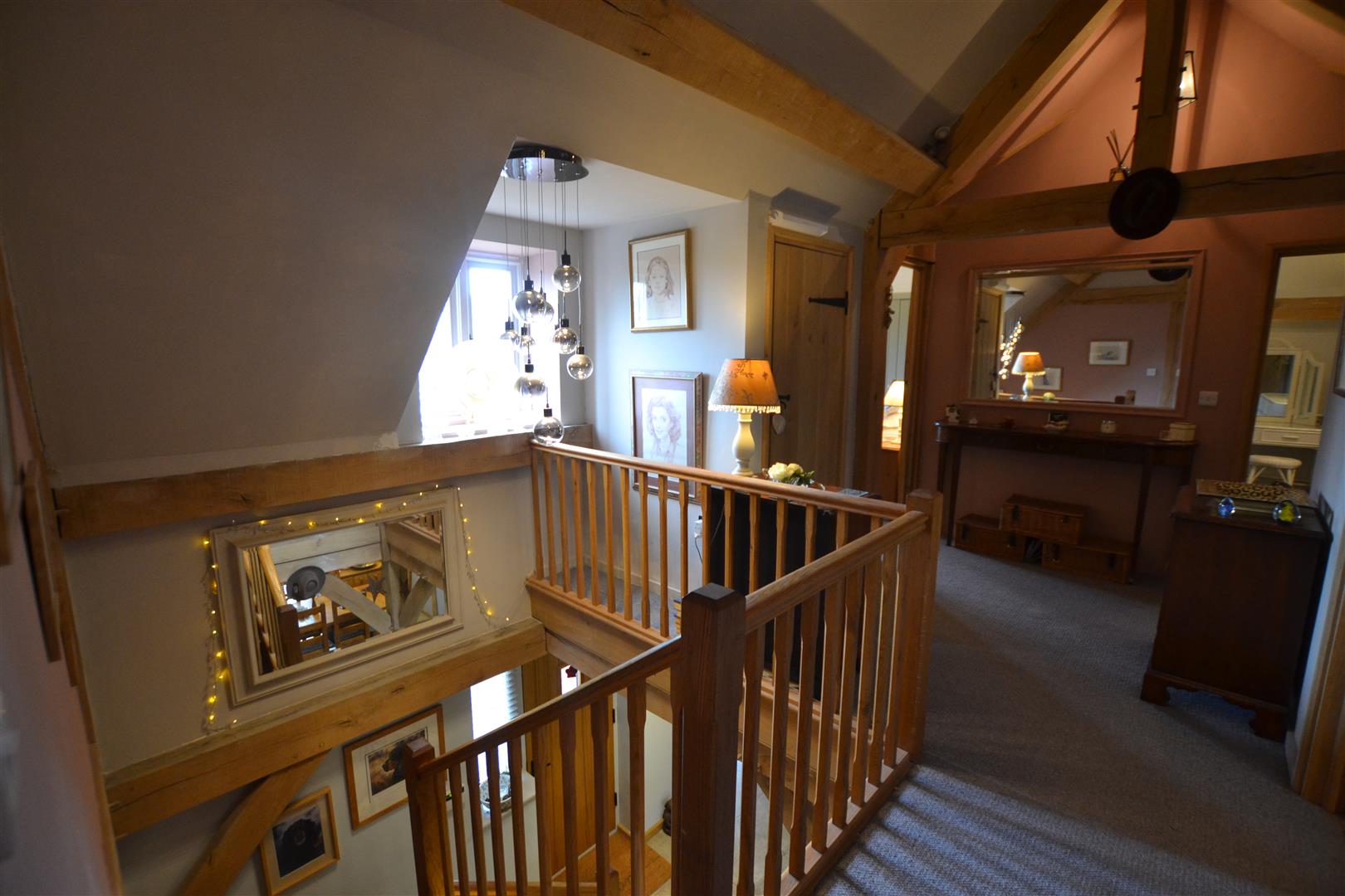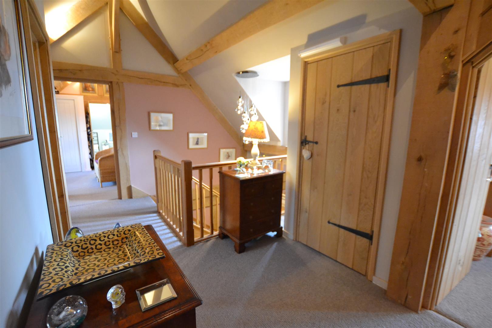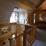 From the dining hall an attractive open oak staircase rises up to an impressive first floor landing with a vaulted ceiling, a window to the front, a latch and lever door into a cloaks cupboard and latch and lever doors giving access to all bedrooms and bathroom as listed.