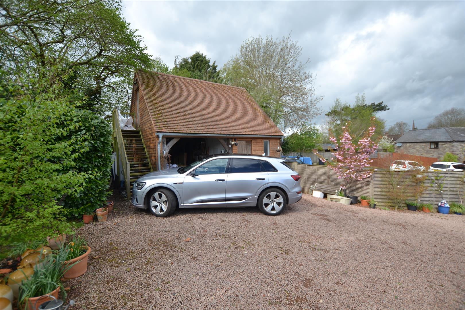 Steps to the side of the garage lead up to a loft room.