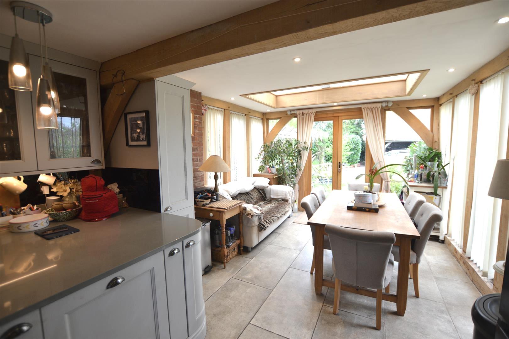 The oak garden room has full length windows overlooking the attractive rear gardens, a roof lantern and French doors giving access to the gardens.