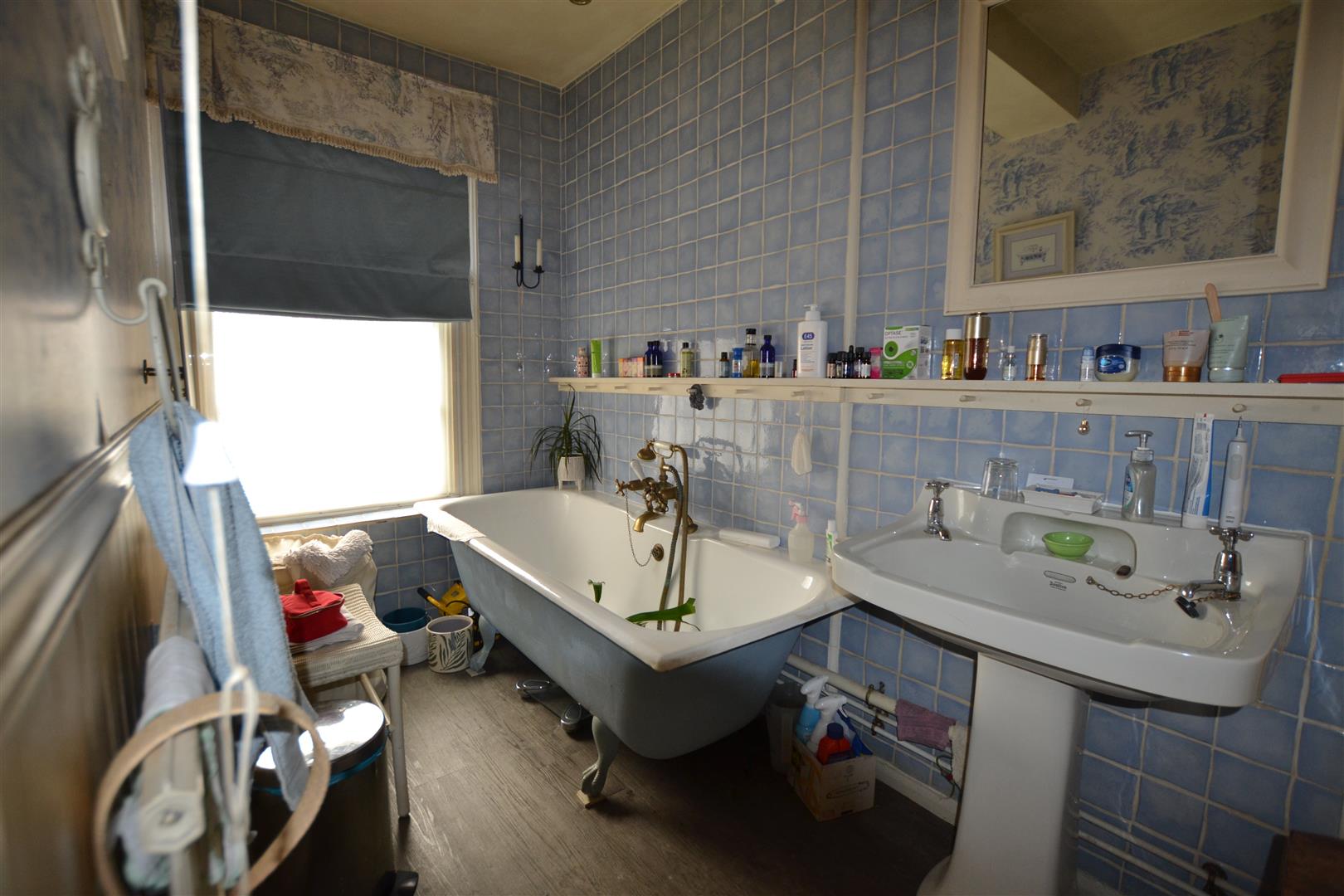 Off the landing a door opens into the bathroom having a cast iron bath on clawed feet, pedestal wash hand basin, ceiling downlighters, built-in cupboards and an opaque secondary glazed window to rear.