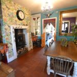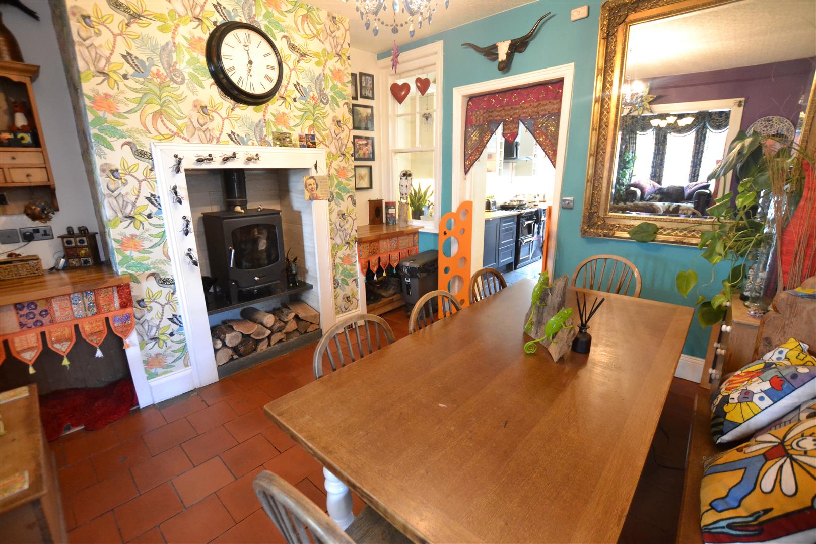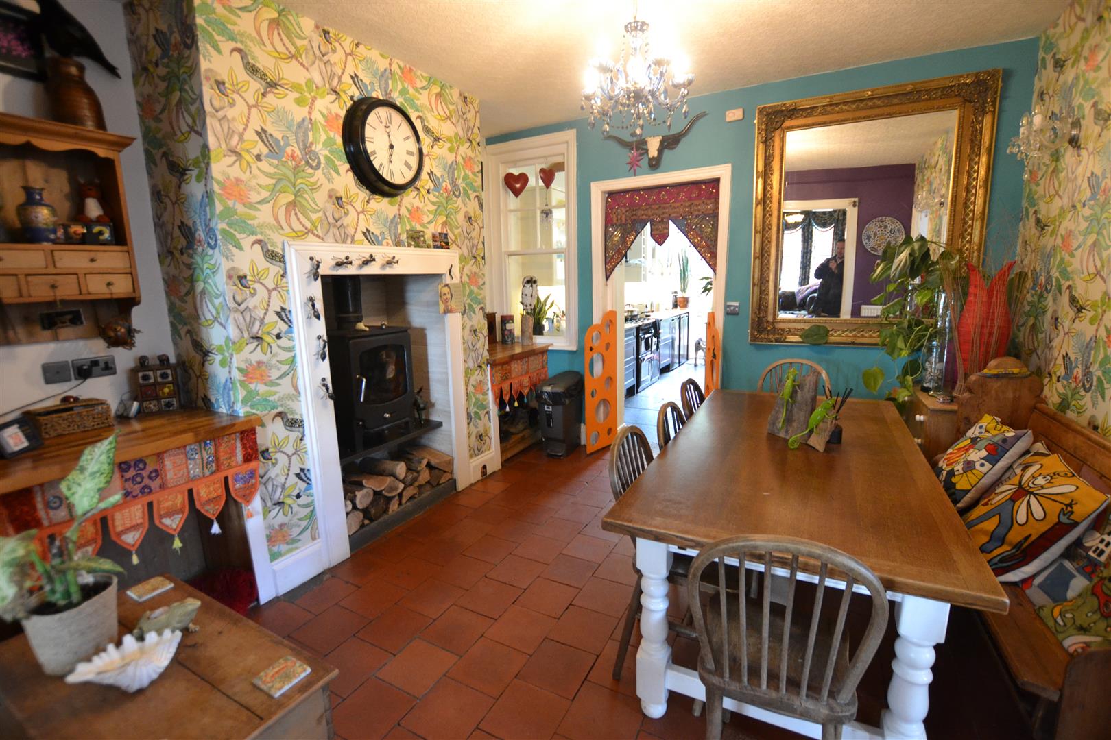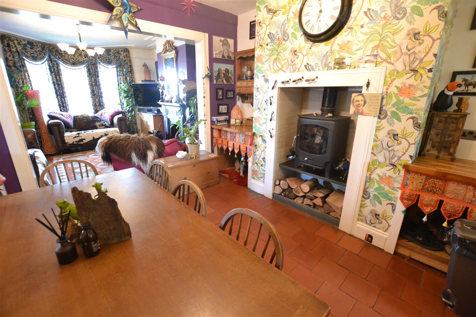 The good size dining room has a wood burning stove, a quarry tiled floor, ample room for a family size dining table and an archway leading into the living room.
