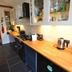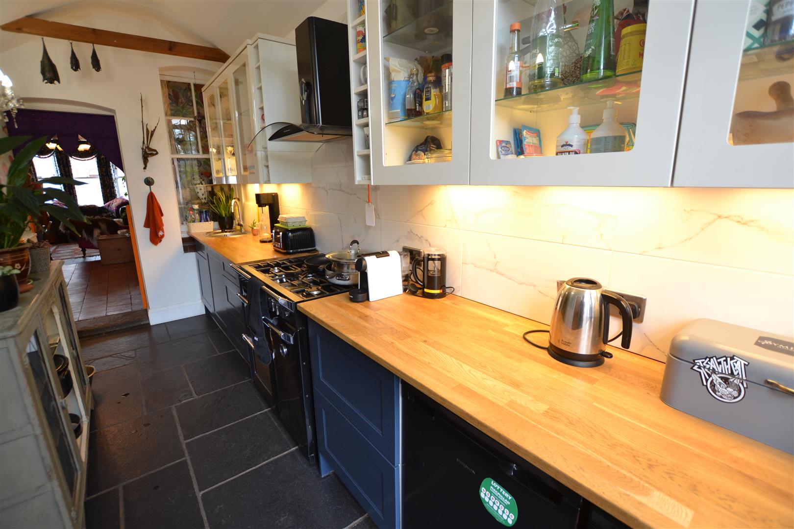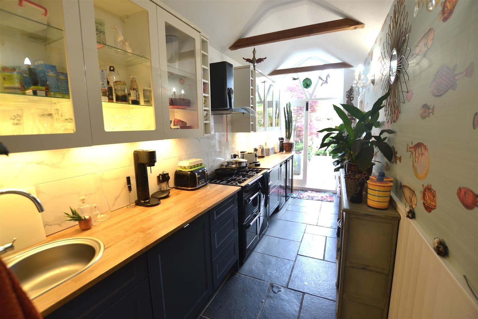 The modern and sympathetically fitted kitchen has wooden working surfaces, base units of cupboards and drawers, space for appliances, sin unit and space for a gas fired range cooker with an extractor hood with light over. There are glass fronted eye-level cabinets, tiled flooring, French doors to the rear with windows over allowing in plenty of natural light and exposed ceiling timbers.