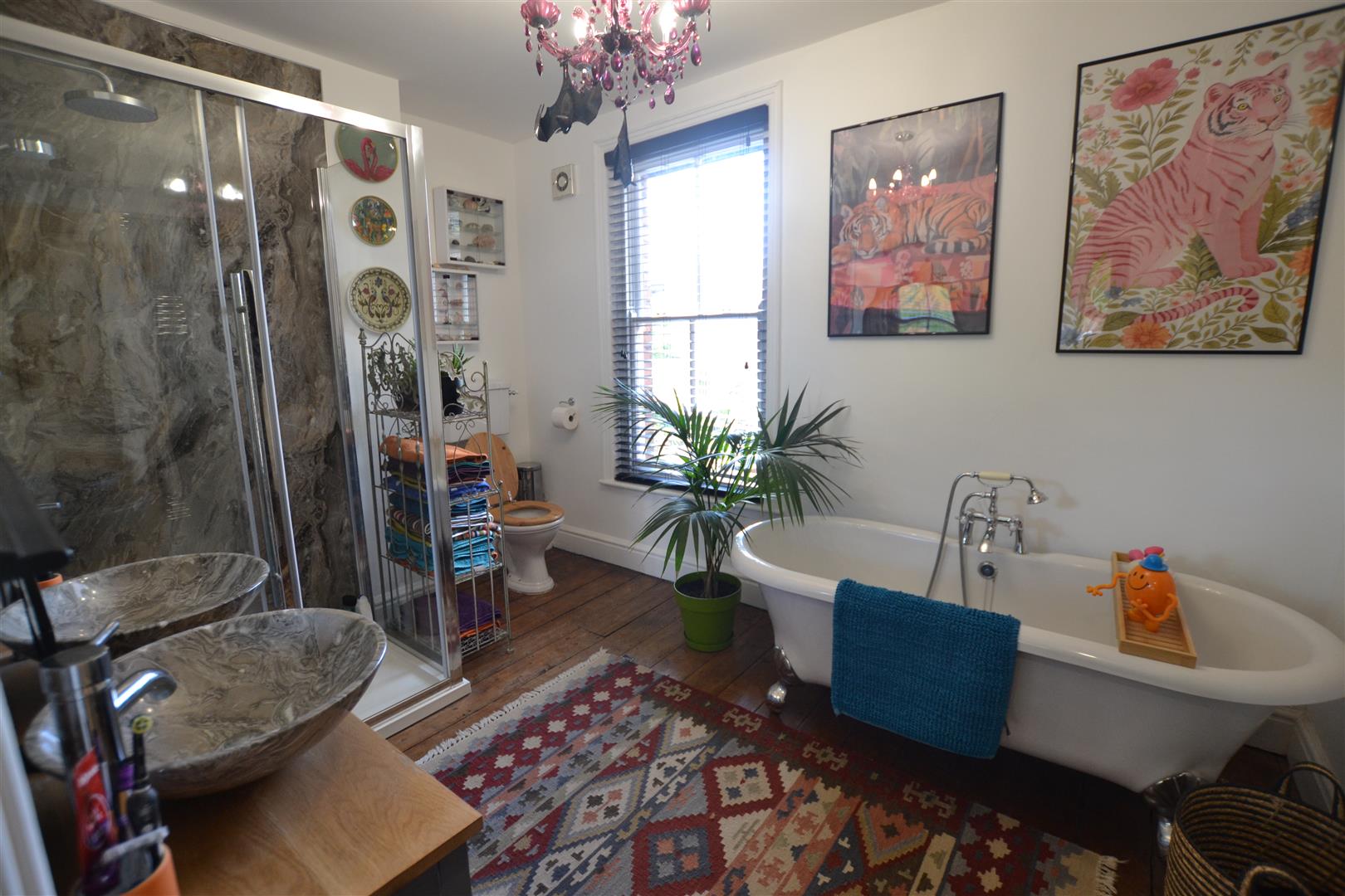 A door from the landing opens into a good size and modern fitted bathroom to include a shower cubicle with a sliding door and a mains fed shower over. There is also a roll ed top bath, low flush WC and twin wash hand basins with a vanity unit under. The bathroom has exposed floorboards, a heated towel rail, a sash window to the rear and an extractor fan.