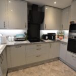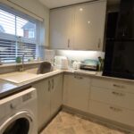 From the reception hall a door opens into the kitchen. The modern fitted Howdens kitchen has units to include an inset, single drainer sink unit, working surfaces with base units under of cupboards and drawers. In a tall housing unit is a Lamona fan assist electric oven, microwave over and cupboard space over and under. There is an inset Lamona 4 ring ceramic hob with extractor hood and splashback over and in a tall housing unit is a built-in fridge/freezer. Also built-in is a dishwasher, planned space and plumbing for a washing machine, a full range of matching eye-level cupboards with downlighting under, ceiling downlighters and a window to front.