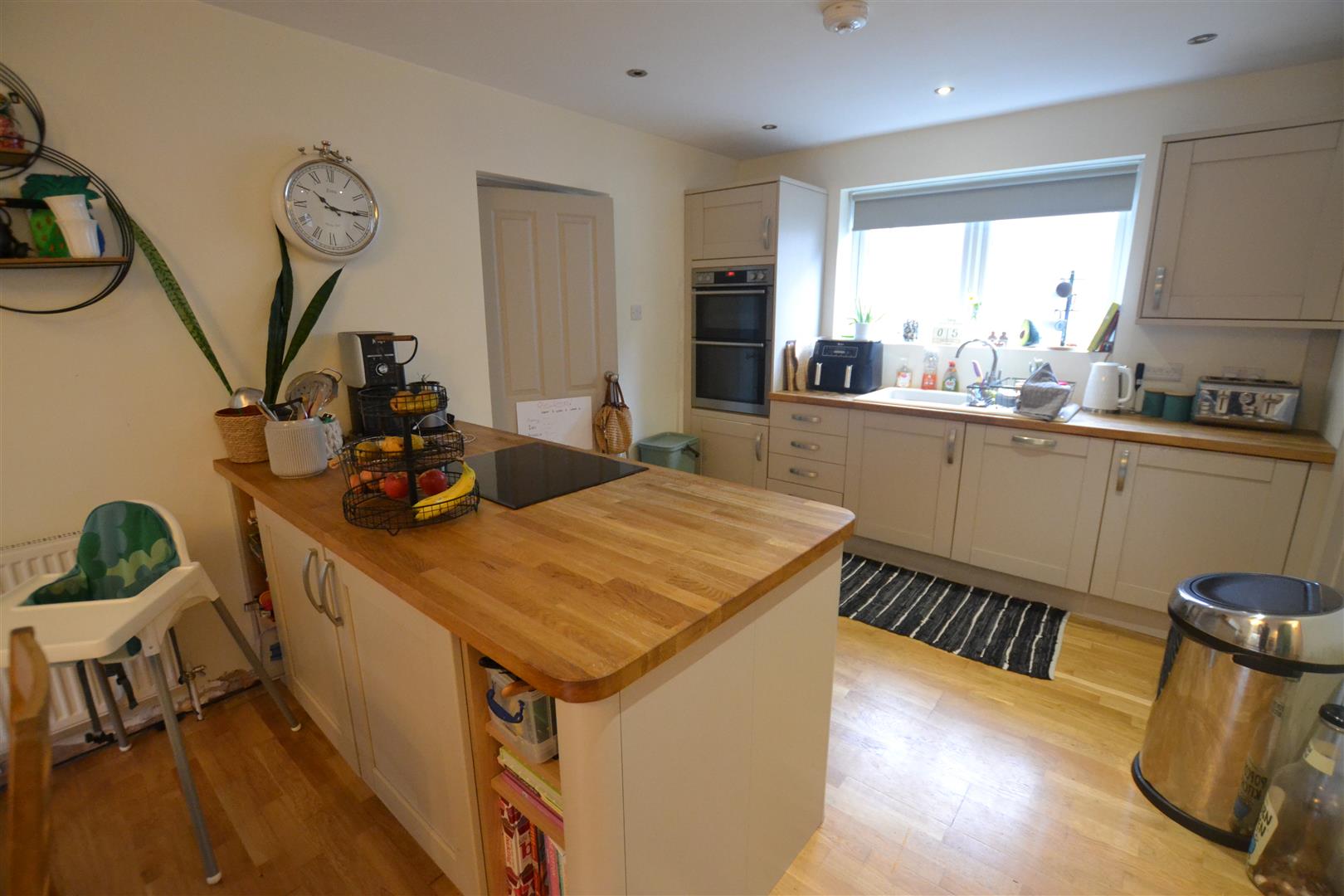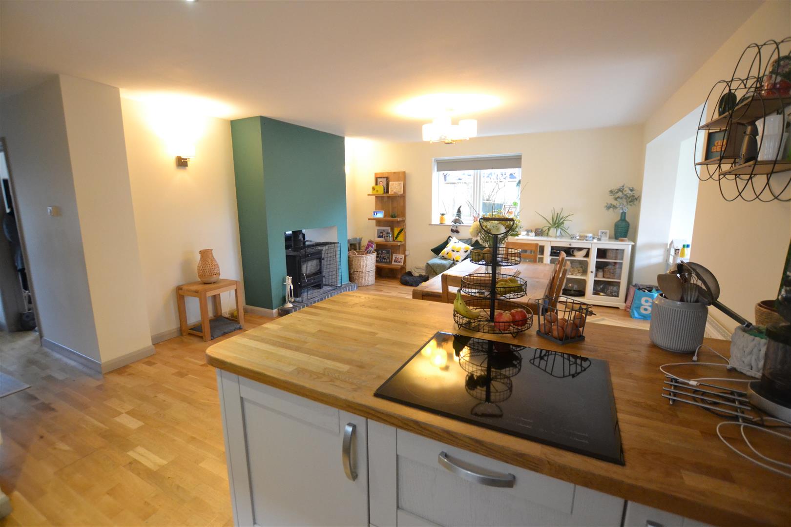 The reception hall leads into the impressive, family kitchen/dining room having a wooden working surface with an inset sink unit with cupboard and an integral dish washer under. The working surface continues with base units to include cupboards and drawers and also an integral electric double oven with cupboards over and under. There is an island with an inset induction hob with cupboards and drawers and shelving under and the kitchen/dining room also has inset lighting, wooden flooring, ample room for a family size dining table, UPVC double glazed windows to either side, a door into a useful pantry with shelving and lighting and also a wood burning stove.