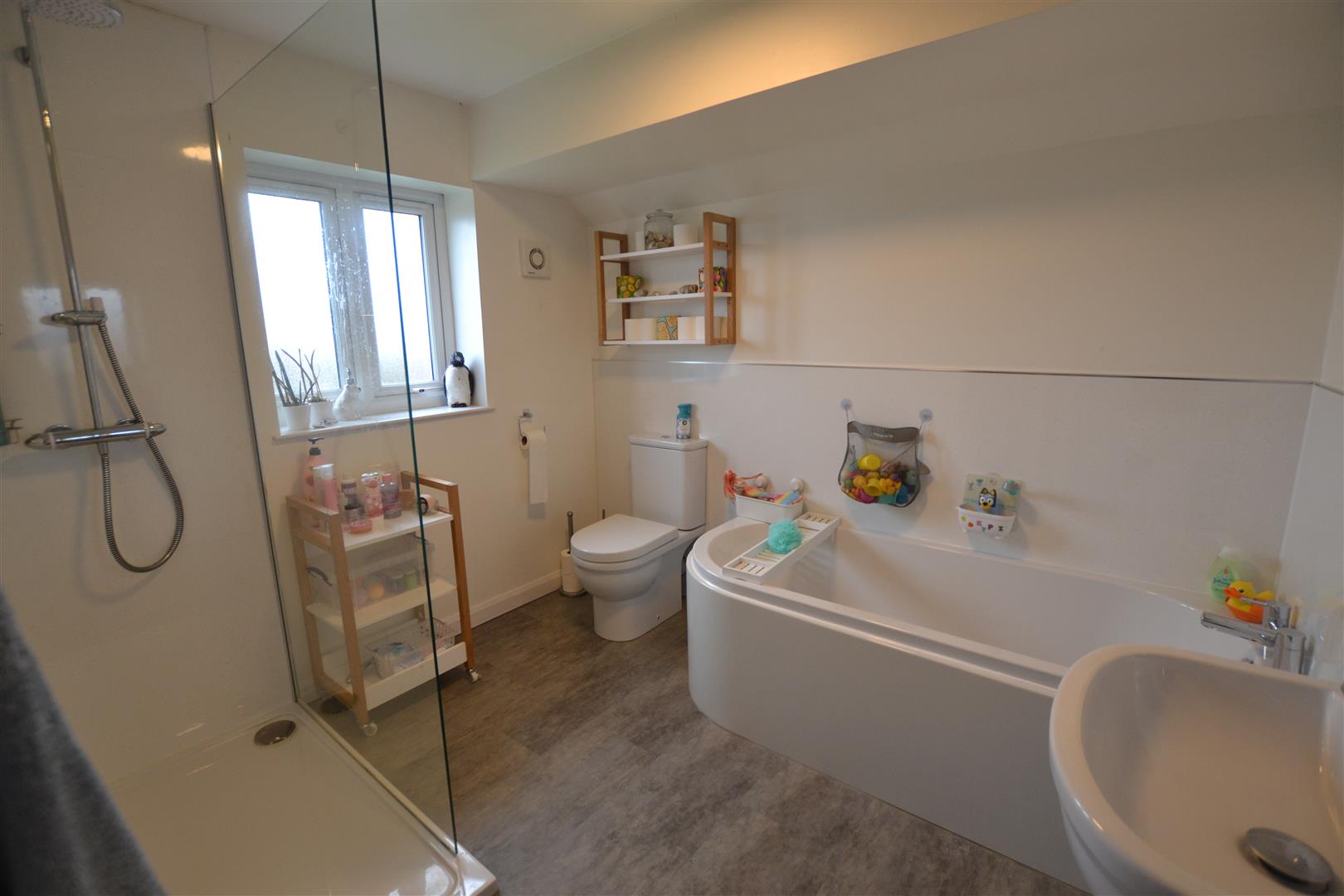 The en-suite bathroom has a P-shaped bath with a mains fed shower over and glass shower screen and a vanity unit with an inset sink unit and a low flush W.C. There is also a frosted UPVC double glazed window to the front and an extractor fan.