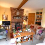 The sitting room has a feature brick fireplace, timber lintel over and standing on a raised heath is a wood burning stove. There is a ceiling timber, alcoves to either side of the chimney breast, night storage heater, window to side and double opening doors to the rear garden.