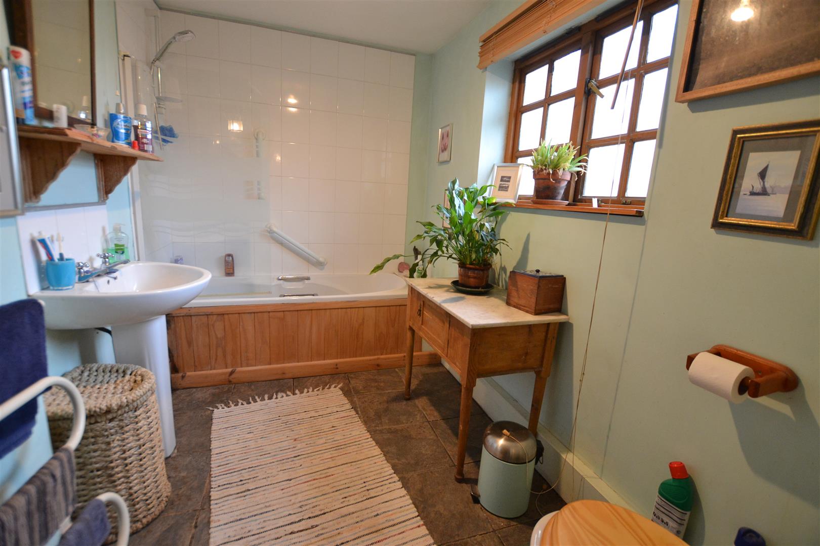 From the dining hall a door opens into the bathroom having a suite of a panelled bath with hand grips, Mira shower over, pedestal wash hand basin and a low flush W.C. There is a window to front, ceiling light, extractor fan, down flow electric hater and a ceramic tiled floor.