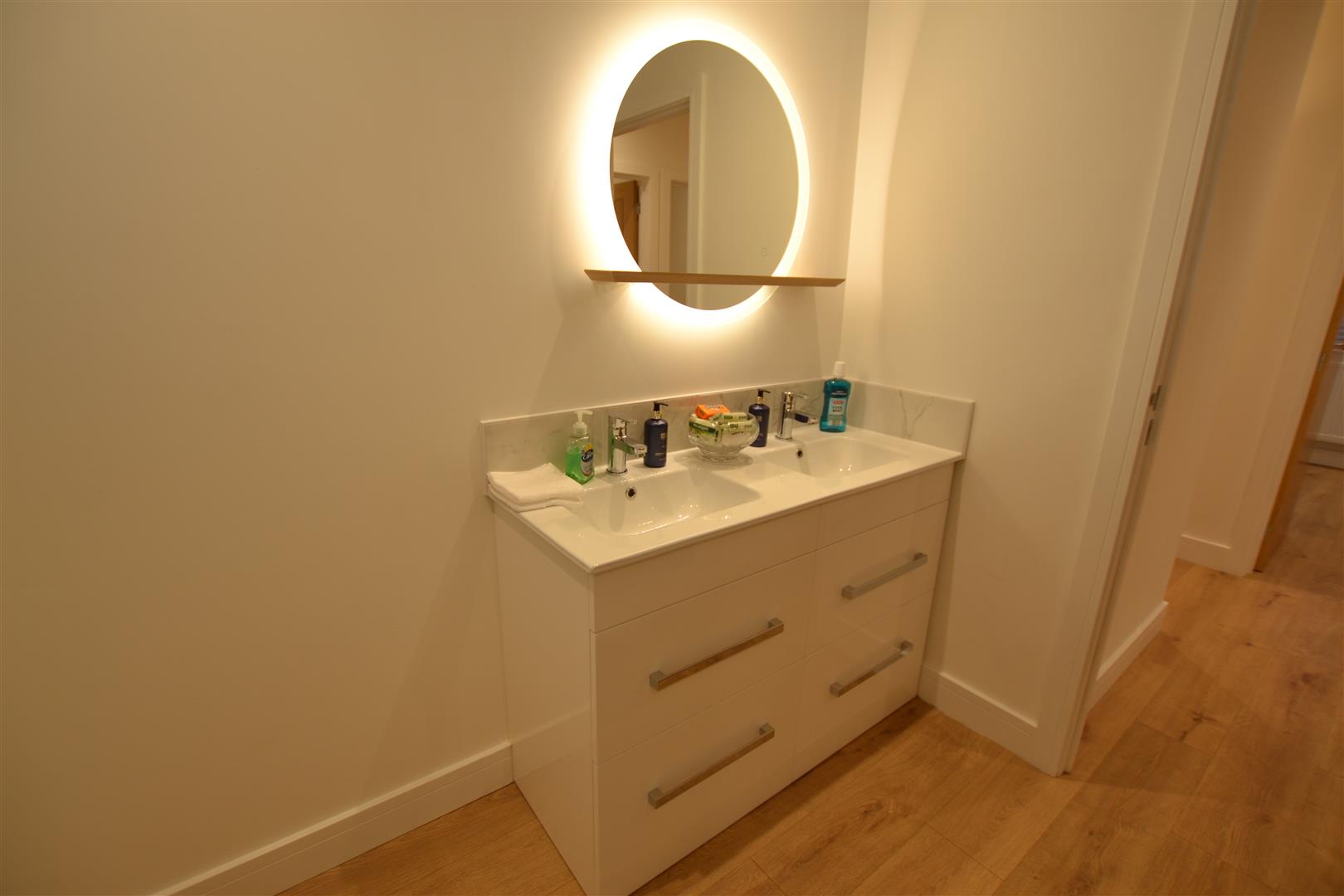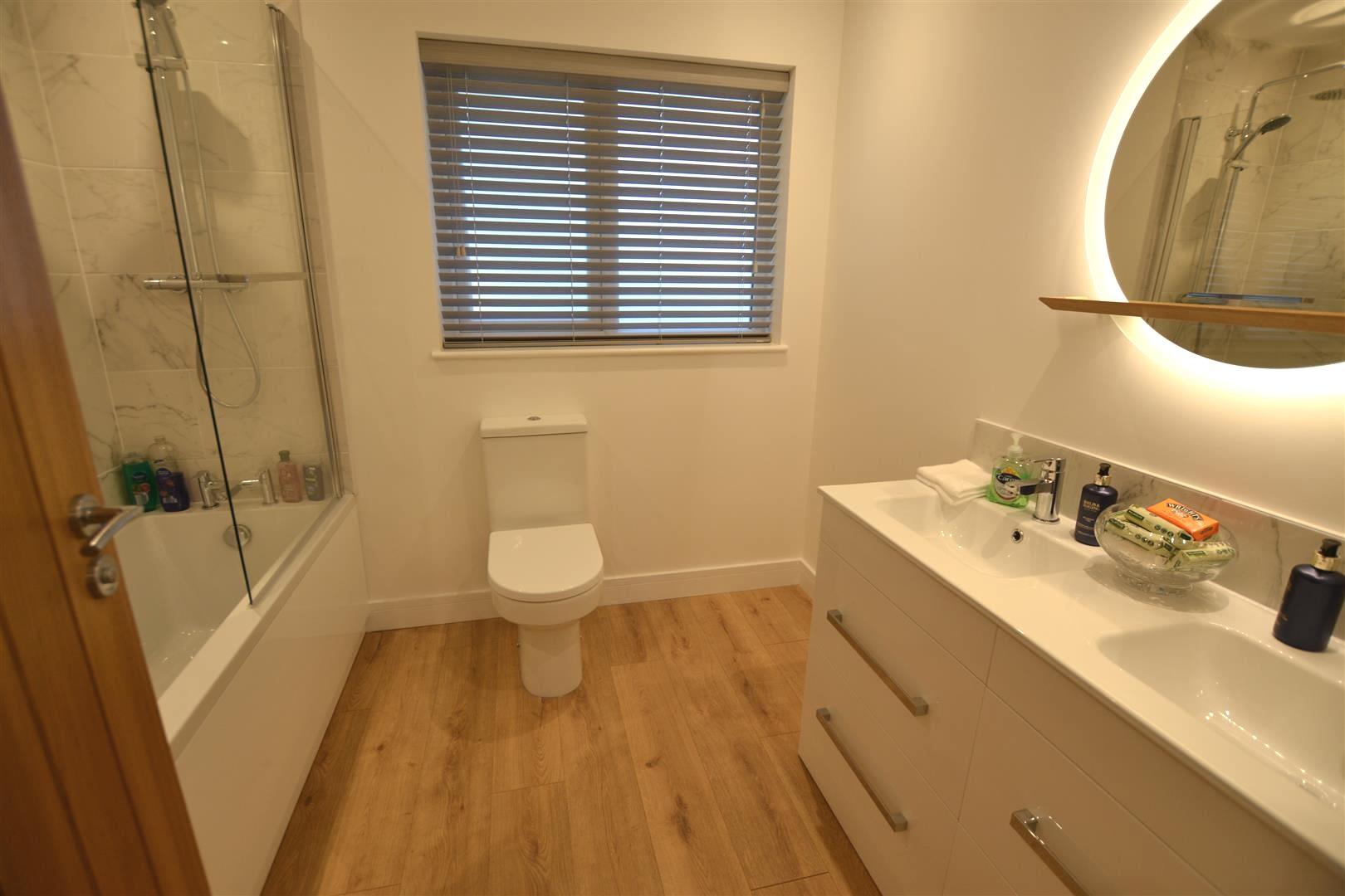 From the reception hall a door opens into the main bathroom having a suite in white of a panelled bath, mixer tap, rain shower and hand shower attachment over and ceramic tiled to ceiling height within the shower area. There is a low flush W.C, built-in his and hers wash hand basins and cupboards under. There is a vanity mirror with light, ceiling downlighter, an opaque double glazed window to rear, a vertical heated towel rail/radiator and an extractor fan over.