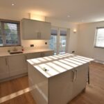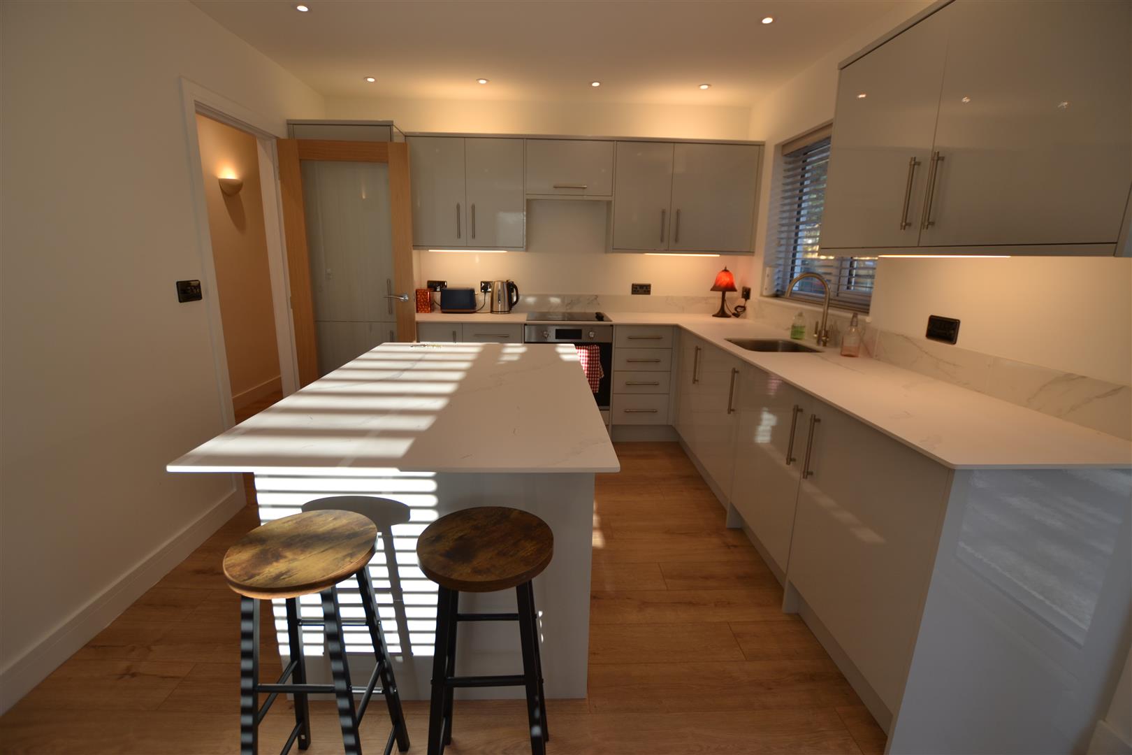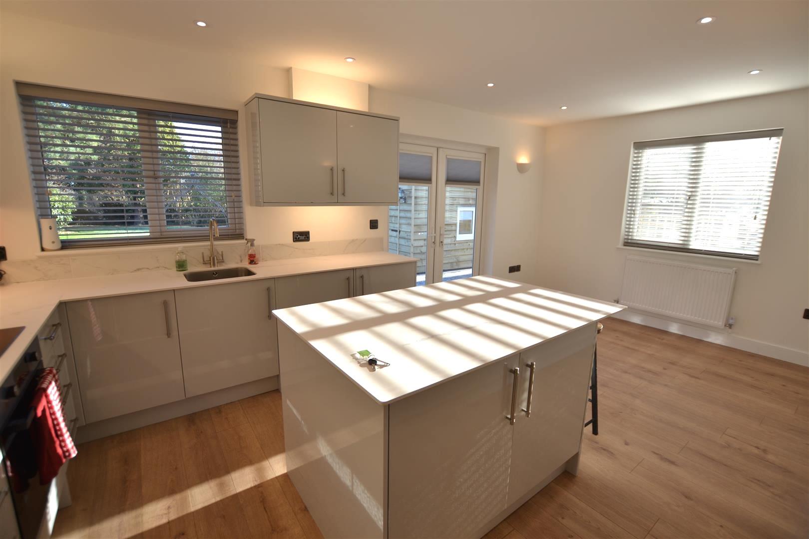 From the reception hall a glazed panelled door opens into the kitchen/dining room. The modern fitted kitchen has units to include an inset, stainless steel sink, mixer tap over, working surfaces to either side and plenty of base cupboards and drawers. There is a built-in washing machine, built-in fridge/freezer, matching eye level cupboards, centre island with cupboards under and breakfast bar. There is also a Lamona electric ceramic hob, extractor hood with light over and a matching fan assisted oven and grill. The flooring is a good quality laminate floor which covers the rooms in the bungalow. In the kitchen/dining room there is plenty of room for a large dining table and chairs, a panelled radiator, ceiling downlighters, smoke alarm, window to rear, window to side and double opening French doors opening to the rear.