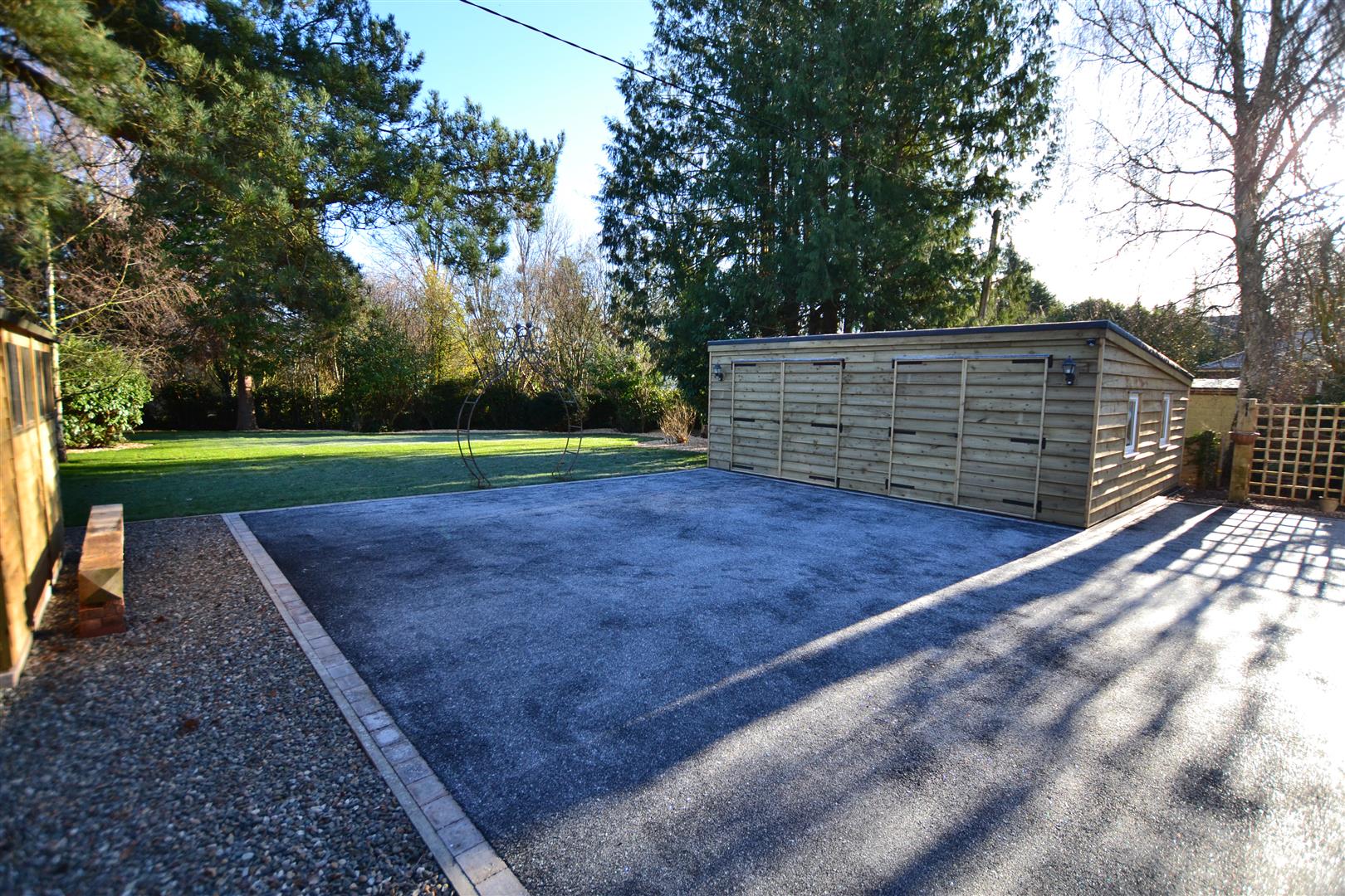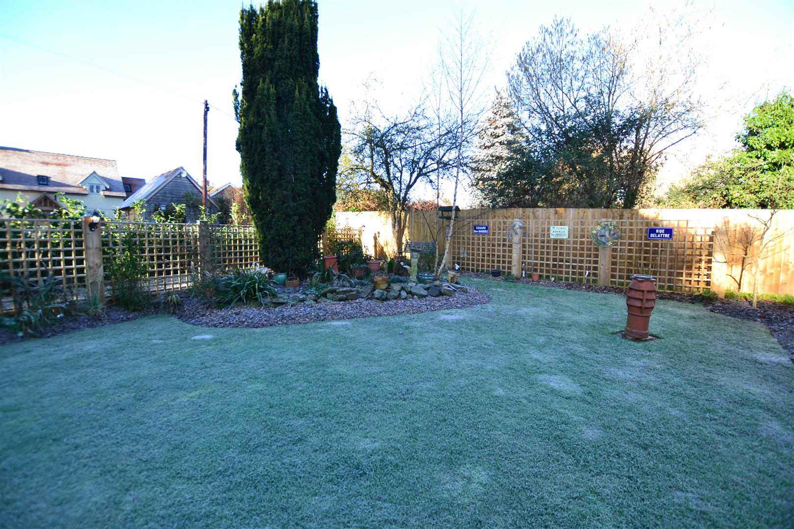 The gardens in total are approximately 0.28 acre. Having a level rear garden, recently turfed, with a mix of trees and plants There are rustic bark covered borders, also private, not overlooked and also has a recently erected, timber built garden shed. To the side is the new oil tank, feeding the oil central heating system.