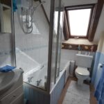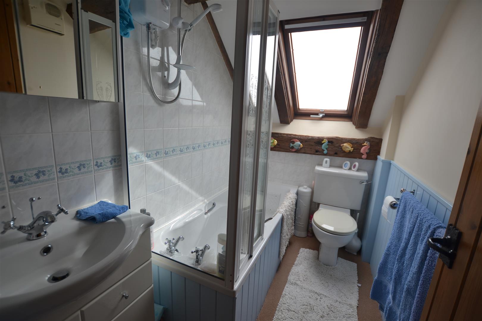 Off the landing a door opens into the bathroom having a suite in white of a panelled bath with handgrips, and a Triton electric shower over, a built-in vanity wash hand basin and a mirror and lighting over . There is a low flush W.C, tiling to splashbacks, exposed wall and ceiling timbers, Velux roof light and a downflow electric heater.