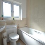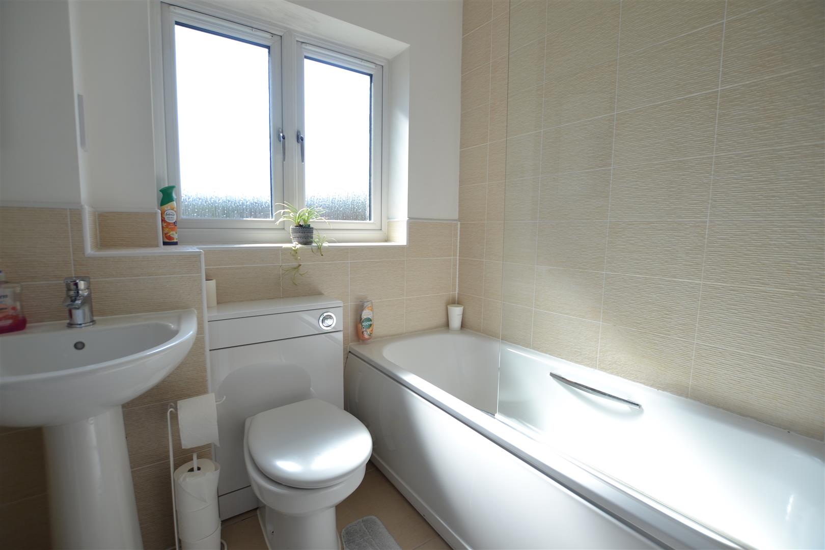 Off the landing a door opens into the bathroom having a suite in white of a panelled bath with handgrips, shower over, pedestal wash hand basin, enclosed low flush W.C, tiled splashbacks, including a tiled window sill with an opaque glazed window to front. There is tiled flooring, vertical heated towel rail/radiator, lighting and an extractor fan.