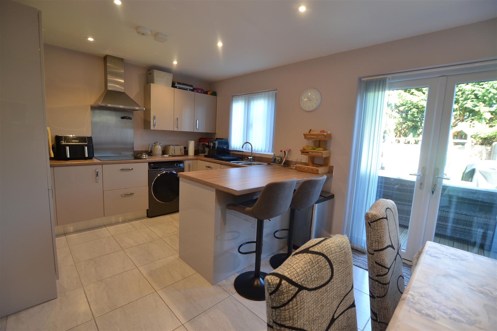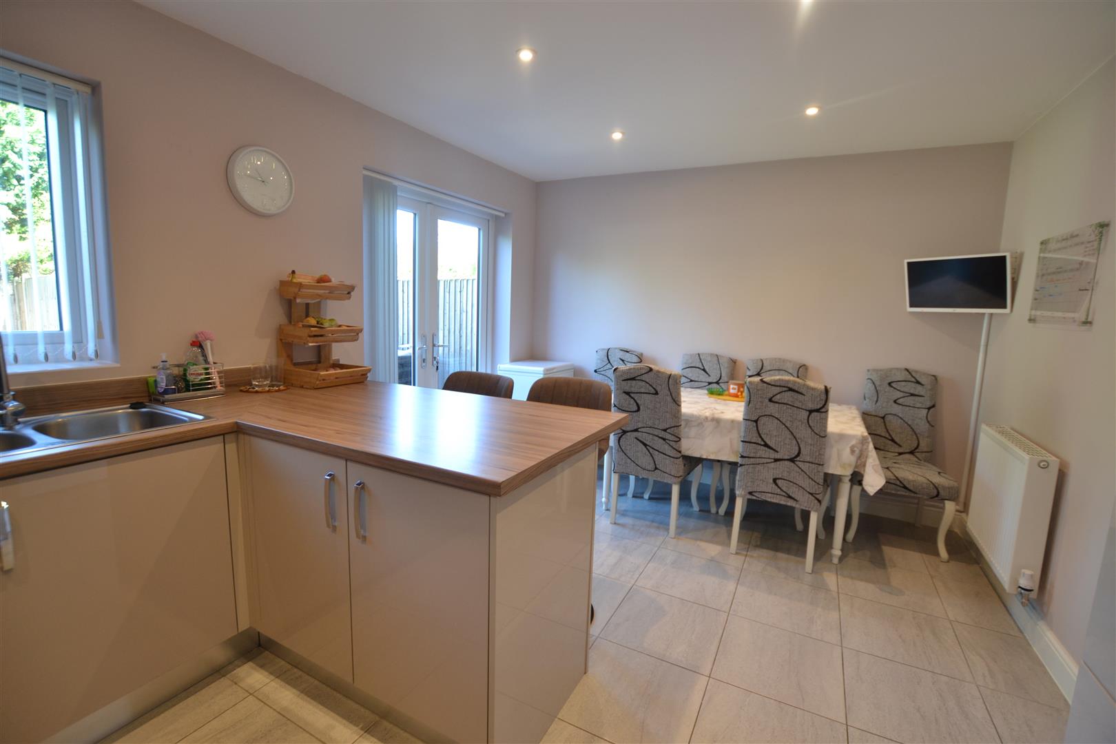 The dining area has room for a dining table and chairs, panelled radiator, ceramic tiled flooring, smoke alarm and double opening French doors opening onto the rear decking.