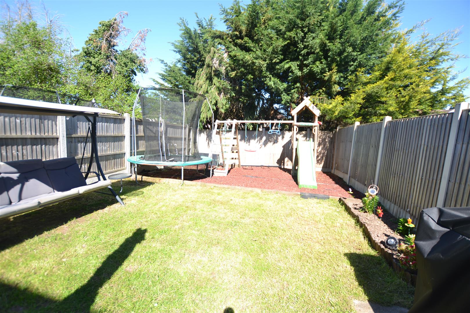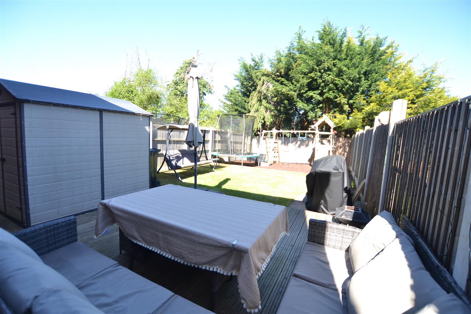 The good size, safe and enclosed garden has fencing to both sides and rear boundary, also a raised timber deck seating area, lawned garden, children's play area, outside lighting, a cold water tap and is relatively private.