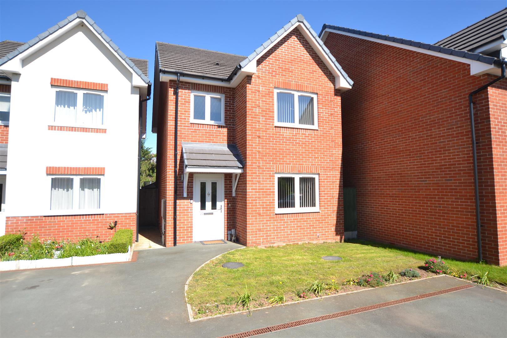 The property is a modern detached house of brick construction under a tiled roof.