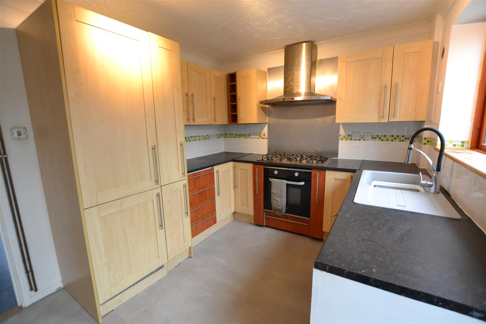 The good size kitchen/breakfast room has a working surface with an inset sink unit with a mixer tap over, cupboard under and planned space with plumbing for a washing machine. The working surfaces continue with base units of cupboards and drawers and built into the working surface is AEG 5 ring gas hob with stainless steel splashback, extractor hood with light over and an electric oven under. The kitchen has a matching larder unit, integral fridge/freezer, eye-level cupboards, tiled splashbacks, room for a small breakfast table, double glazed window looking into a sunroom to rear and a half glazed door opening out to the sunroom.