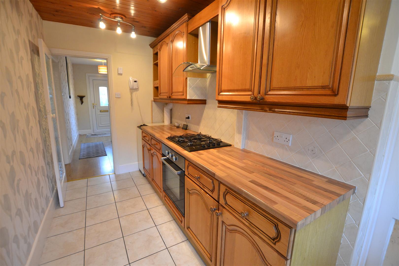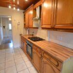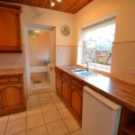 The kitchen has units to include an inset, one and a half bowl, single drainer sink unit, working surfaces and base units under of cupboards and drawers. There is an inset 4 ring Algor gas gas hob, extractor hood with light over and a Bush fan assisted oven with grill under. There are eye-level cupboards, lighting, planned space for a fridge and a window to rear.