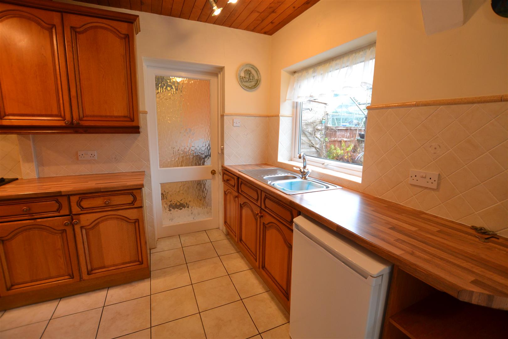The conservatory is UPVC double glazed with a polycarbonate roof with opening windows, tiled floor and a door into the garden.