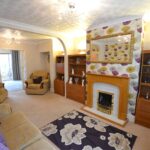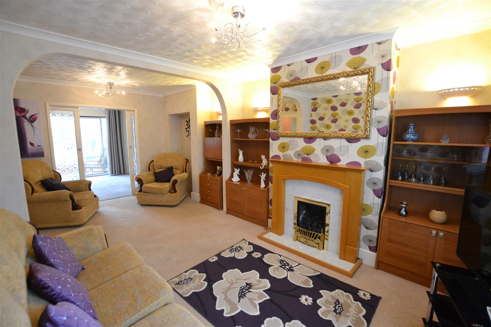 The lounge has a bay window to front, panelled radiator, modern fireplace with coal and living flame effect gas fire, alcoves to either side and glazed sliding doors opening into the dining room.