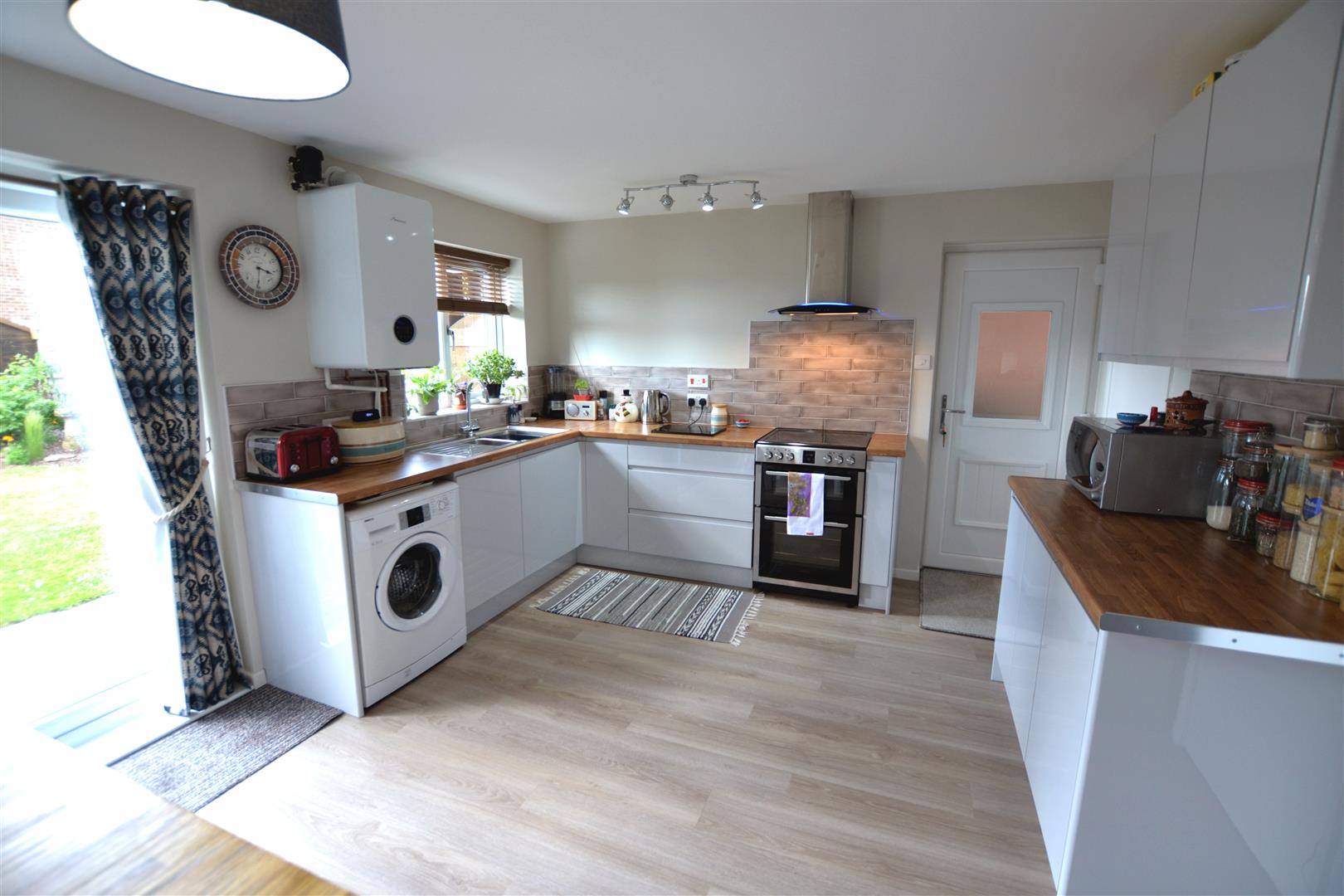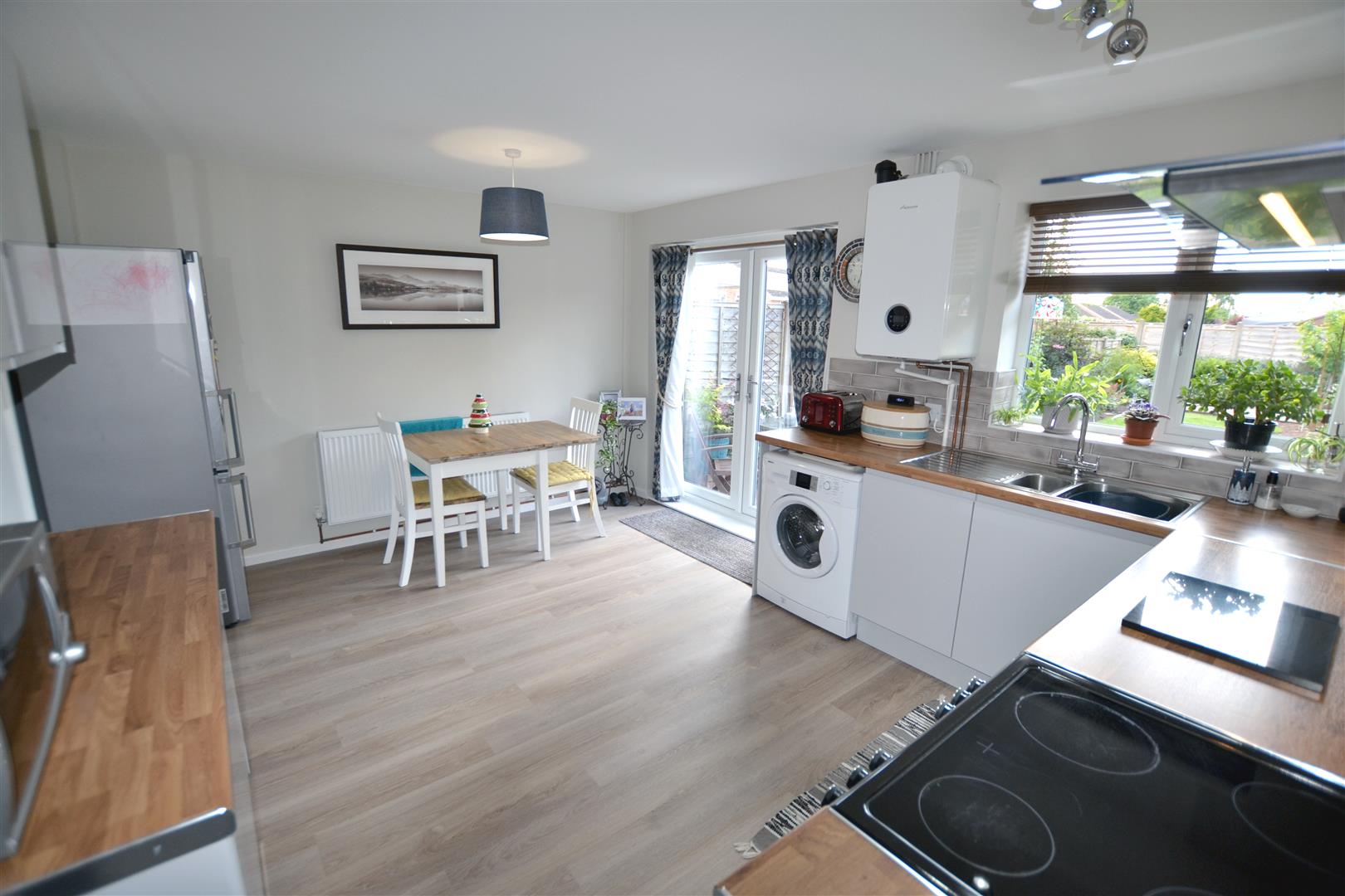 The modern and well fitted kitchen has a working surface with an inset stainless sink unit with a mixer tap over and cupboards under and space and plumbing for a washing machine under. The working surfaces continue with base units of cupboards and drawers and a planned space for an electric cooker with a stainless steel extractor hood with light over and further working surfaces with cupboards under. The kitchen also has a range of matching eye-level cupboards and a UPVC double glazed window overlooking the attractive rear garden. The kitchen/dining room has ample room for a family sized dining table, room for and upright fridge/freezer, a UPVC double glazed door giving access to the side the property, a door into a large pantry with shelving and lighting and UPVC double French doors opening out to the rear garden. Situated in the dining room is a recently installed Worcester gas combination boiler.