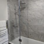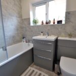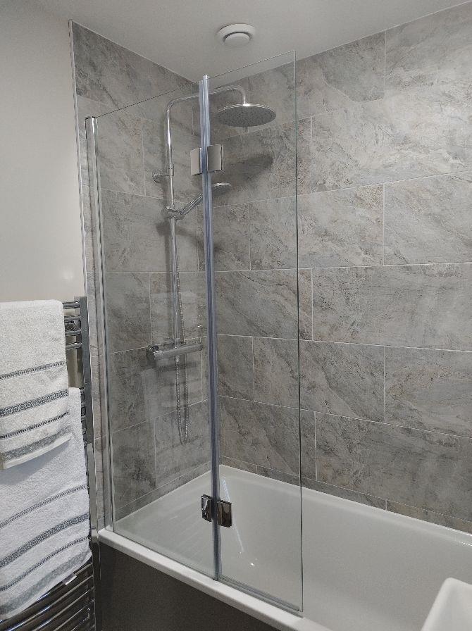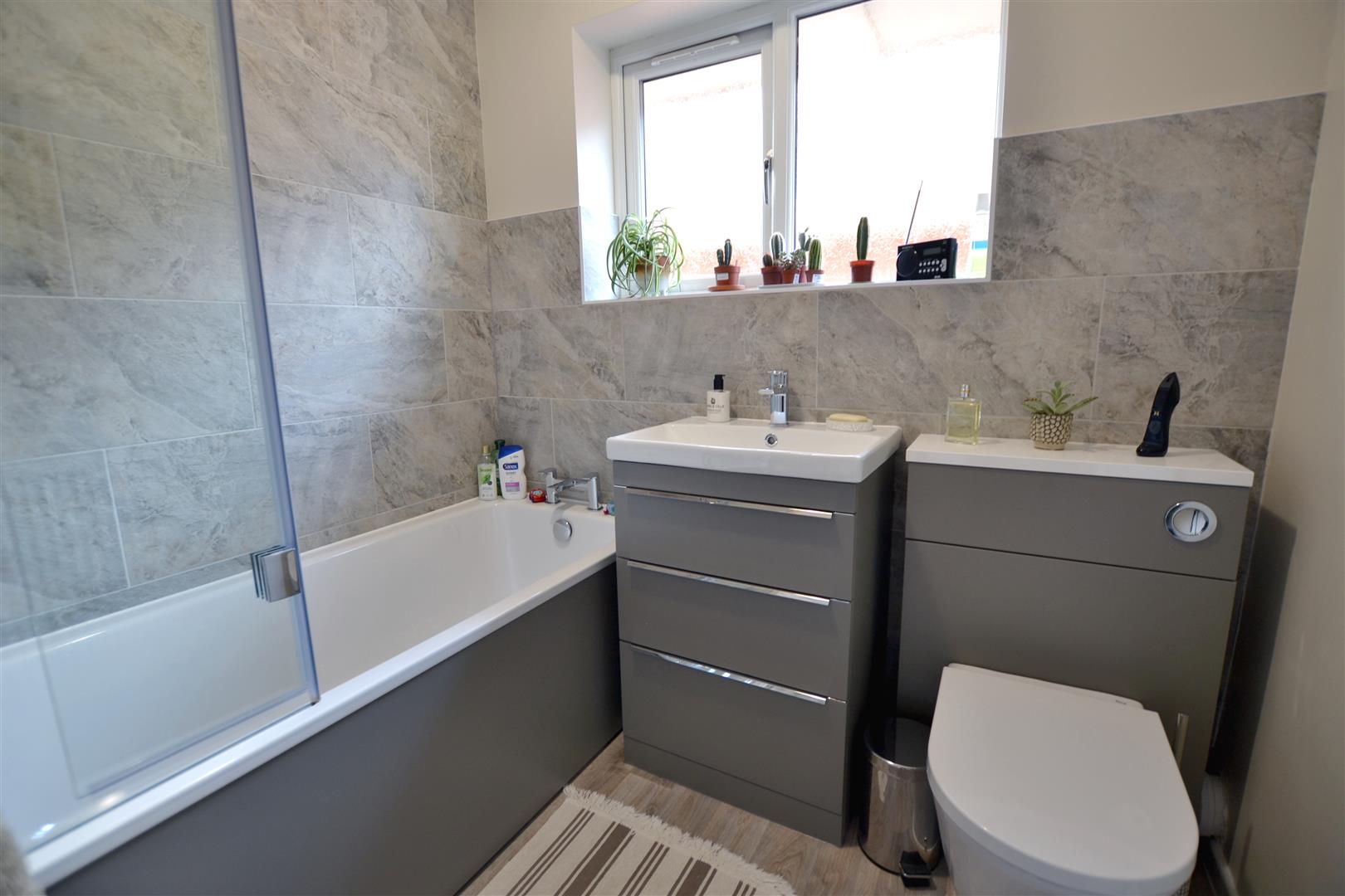 From the landing a door opens into the bathroom having a modern suite to include a side panelled bath with a mains fed shower over and folding glass shower screen, a wash hand basin with drawers under and a low flush W.C. The bathroom has tiled splashbacks,a frosted UPVC double glazed window to side and an extractor fan.