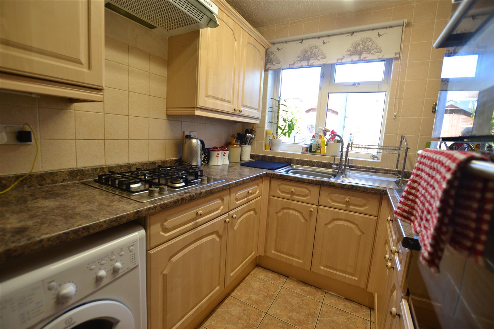 The kitchen has an inset stainless steel, single drainer sink unit, working surfaces to either side with base units of cupboards and drawers. There is an inset 4 ring gas hob, built-in fan assisted electric oven with grill, extractor hood with light over, cupboard space over and under, space and plumbing for a washing machine, tiled splashbacks and eye-level cupboards. The kitchen has spotlighting and lighting, power points, window to rear, room for an upright fridge/freezer and a panelled radiator.